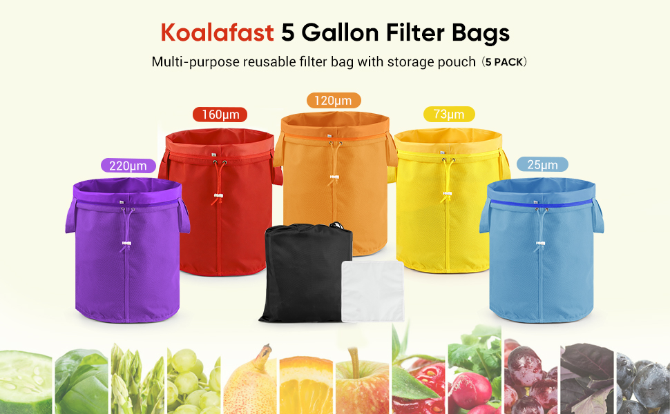 Multi-density Filter Mesh: Our 5-gallon micron bag set includes five bags with different filtration ratings (25, 73, 120, 160, 220 microns). Each features color-coded identification and clear rating labels for straightforward selection. Includes a 25-micron mesh screen for pressing
