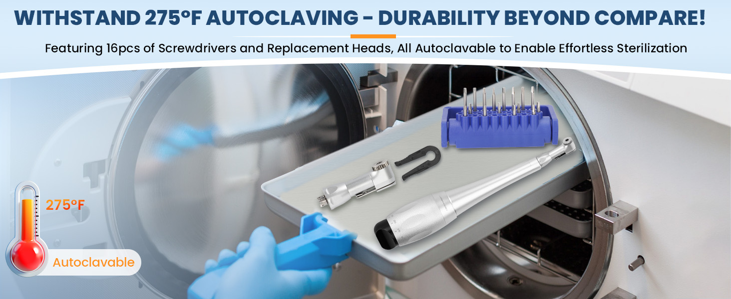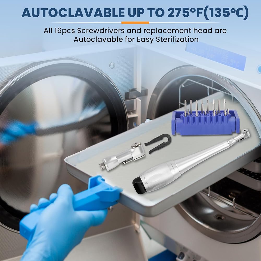Quality Dental Tools: Dental hex screwdriver and torque wrench, made from high-quality aluminum alloy, offer excellent durability and corrosion resistance. Both tools are autoclavable up to 275℉, ensuring a hygienic and safe environment for dental work while minimizing contamination