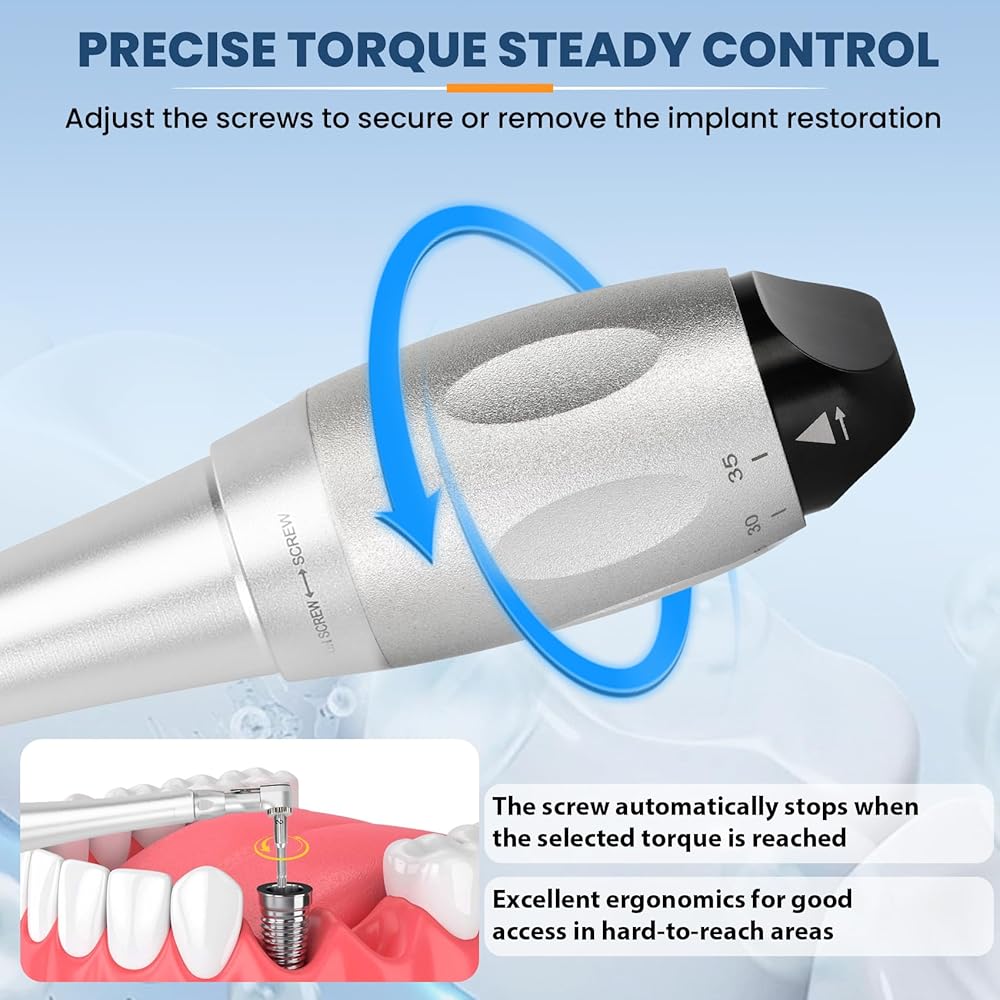 Precise Torque Control: This universal dental hexagon screwdriver offers precise torque control with 7 adjustable settings (5-35 N/cm). It automatically stops when the set torque is reached, utilizing pre-tension to prevent screws from loosening or breaking, ensuring safer and more reliable dental work!