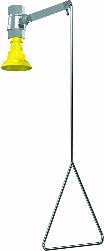 Spintec drench shower, vertical supply, plastic shower head, galvanized steel pipe with yellow polyurethane paint, 1". NPT water supply, SEI certified to ANSI Z358.1-2009. Exceed minimum water flow of 20 GPM at 30 PSI.