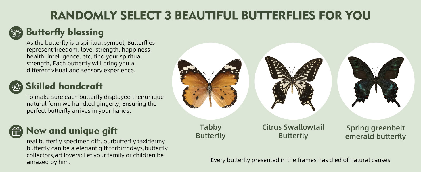 Characteristic - Real butterflies are natural, So every taxidermy butterfly is different and there may be slight deviations, the beauty of the taxidermy animals is unique.Only after the butterflies die a natural death, researchers will carefully make the butterflies into real taxidermy butterflies.