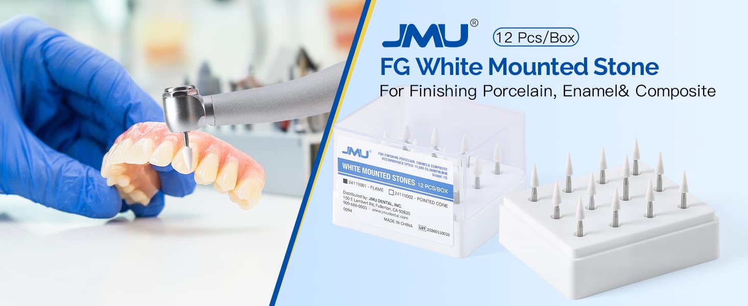 JMU FG White Mounted Stone, Pointed Cone Aluminum Oxide Finishing Stones, for Dental Enamel & Porcelain Finishing, 12 Pcs/Box