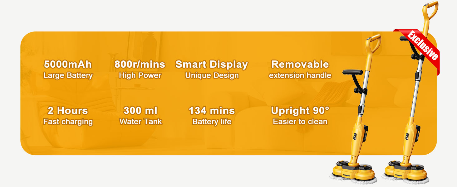 【𝐁𝐞𝐬𝐭 𝐂𝐞𝐫𝐭𝐢𝐟𝐢𝐞𝐝+ 𝟔,𝟎𝟎𝟎𝐦𝐀𝐡 𝐋𝐚𝐫𝐠𝐞 𝐁𝐚𝐭𝐭𝐞𝐫𝐲 𝐚𝐧𝐝 𝐜𝐡𝐚𝐫𝐠𝐢𝐧𝐠 𝐭𝐢𝐦𝐞】This is probably the Longest Working 800RPM power mop you can buy! The latest technology 3.0 blade compression construction battery is the same size and has 30% more capacity compared to the old 2.0 construction battery. 2.5 hours to fully charge,two batteries can work continuously for 420 minutes (low speed mode). Enough time to deep clean floors, bathrooms, and everywhere in your house