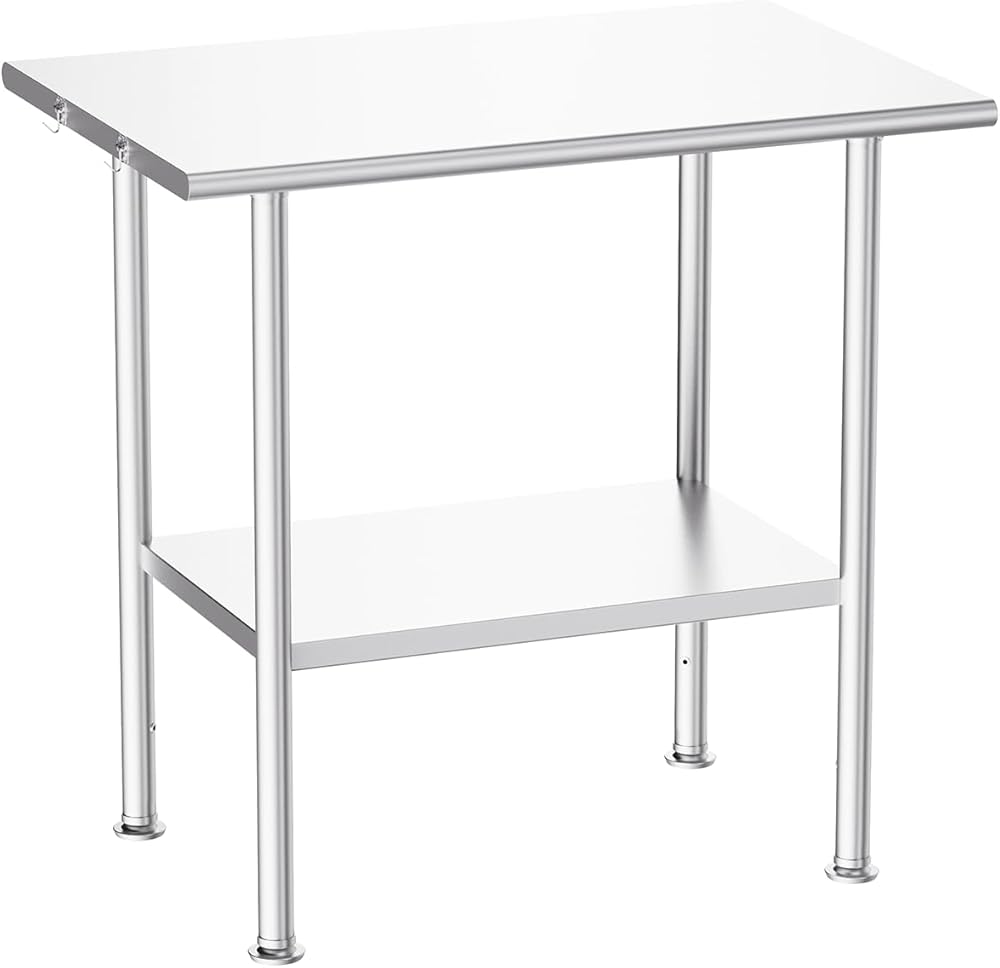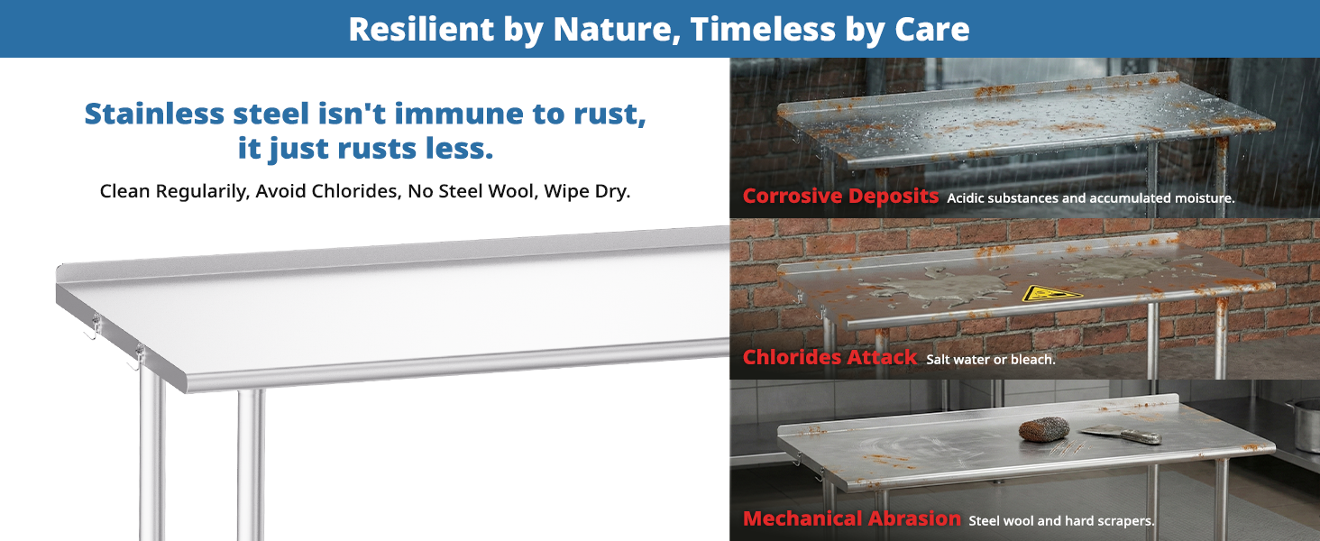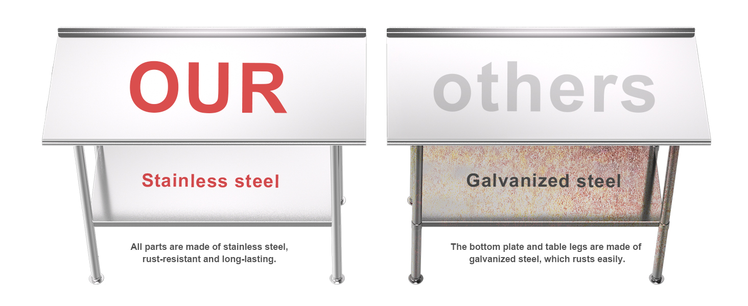 【 Heavy-Duty Prep Station & Corrosion Resistant】Measuring 24"D x 48"W x 34.6"H, this workstation features a premium all-stainless steel construction (including legs) that supports 700 lbs,, making it ideal for cutting vegetables, assembling equipment, or staging plated dishes. Constructed from premium 430 stainless steel, the surface provides excellent corrosion resistance, ensuring it remains smooth and durable even in humid kitchen or outdoor BBQ environments.