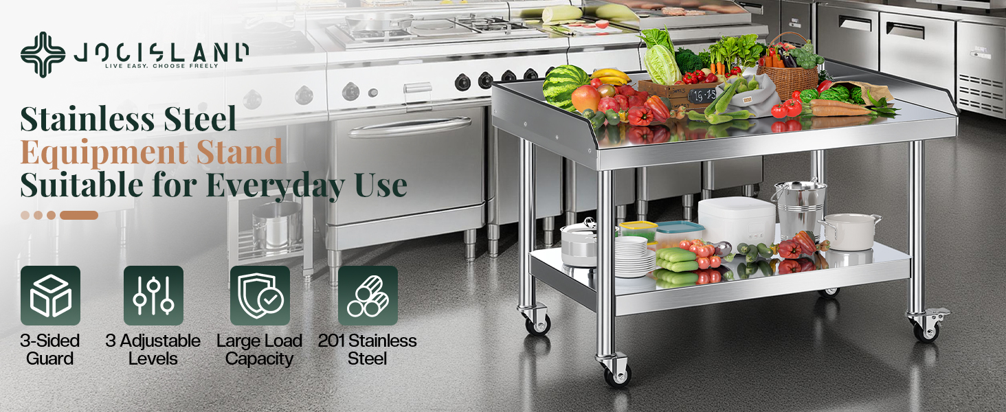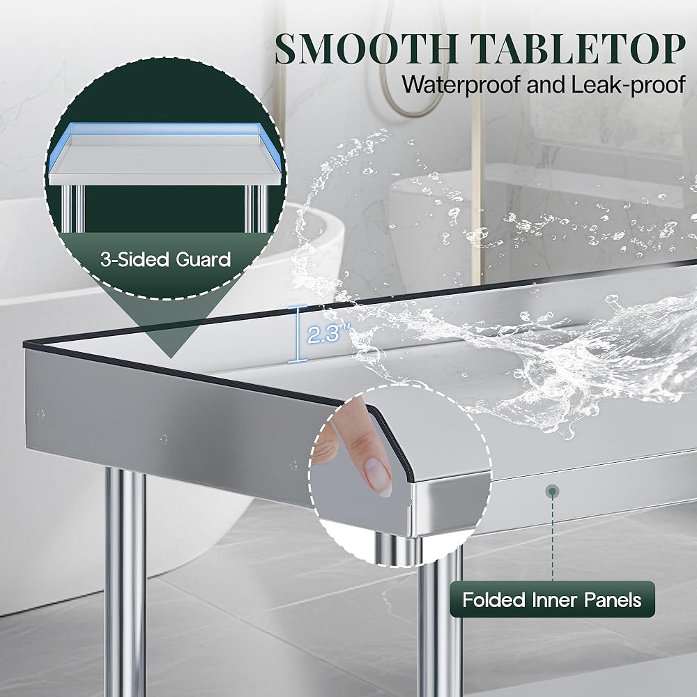 3-Sided Backsplash & Adjustable 3-Tier Shelf: 2.3-inch raised edge on three sides of stainless steel stand to prevent items from sliding off, while the adjustable 3-tier lower shelf offers flexible storage