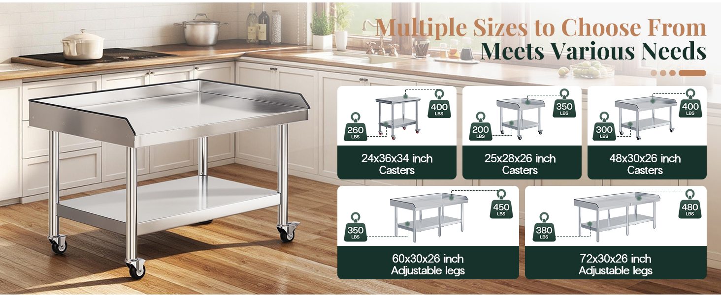 Adjustable Legs/Locking Casters for Versatile Uses: 4 Casters with 2 locking wheels for mobility and stability. Kitchen prep table is suitable for kitchens, garages, patios, bars, and hospitals