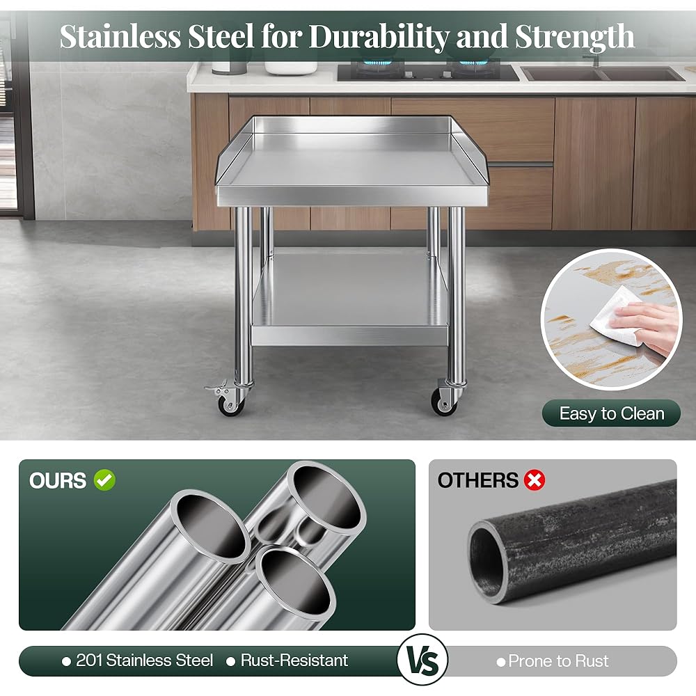 Durable & Sturdy: Equipment stand is made of NSF certified stainless steel with a reinforced triangular structures at corners of the tabletop for added stability, corrosion-resistant, durable, easy to clean