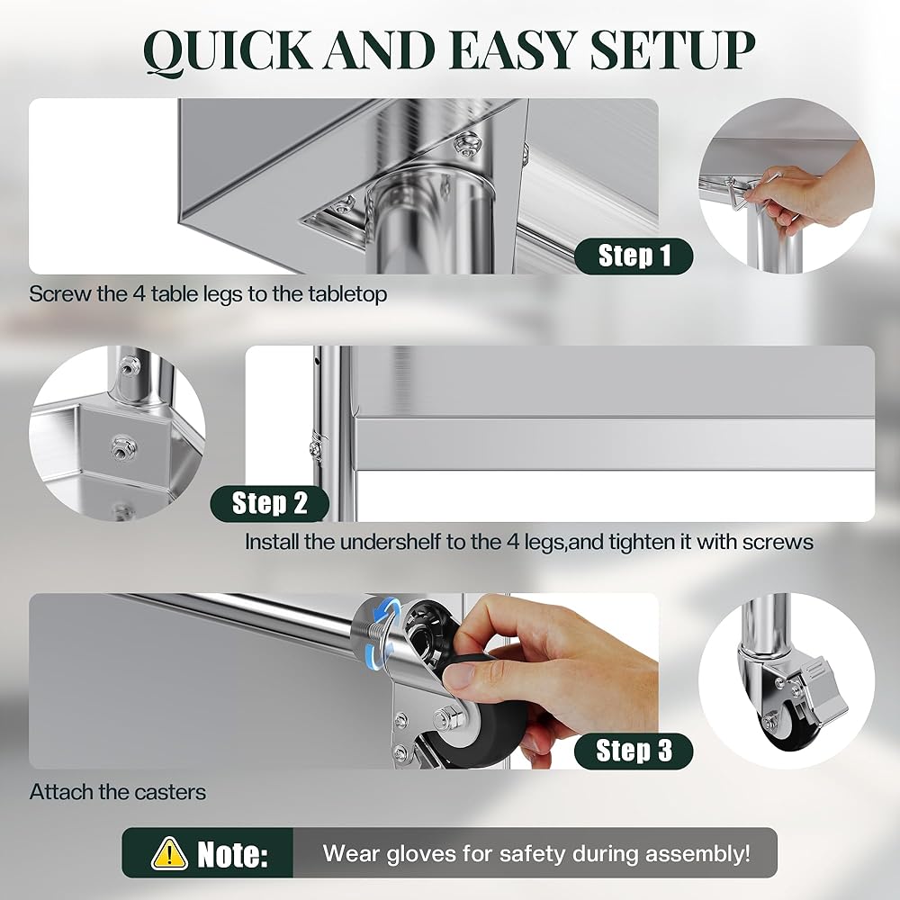 Quick Assembly & Secure Packaging: Stainless steel prep table assembles in about 10 minutes with clear instructions. Protective film and reinforced packaging ensure safe delivery, gloves included.