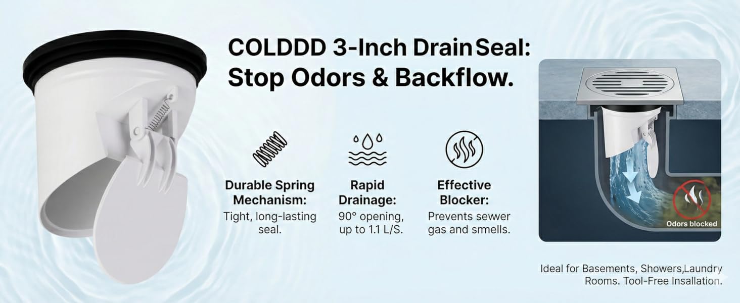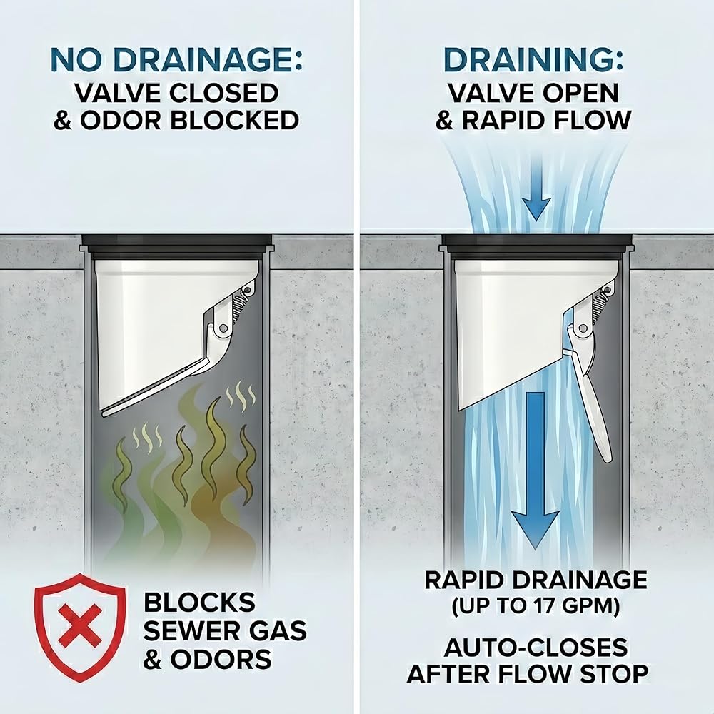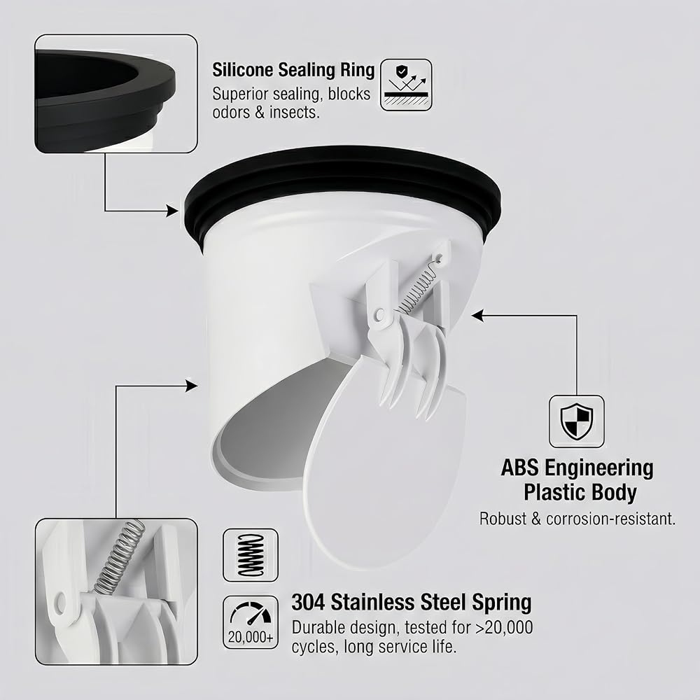 EFFECTIVE ODOR & BACKFLOW BLOCKER: Keeps your home fresh by tightly sealing against sewer gas and bad smells. The strong spring tension also acts as a reliable backflow preventer, stopping wastewater from rising back up during heavy rains.
