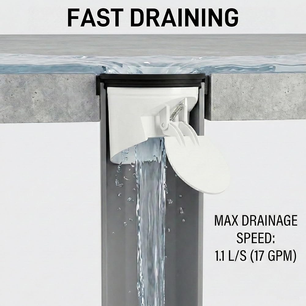 HIGH FLOW & ANTI-CLOG DESIGN: The hinged flapper opens fully up to 90 degrees under water pressure, achieving a rapid drainage speed of up to 1.1 L/S (17 GPM). This high-capacity flow allows water and debris to pass through instantly without backing up, solving the slow-draining issues often seen with restrictive silicone diaphragm seals.