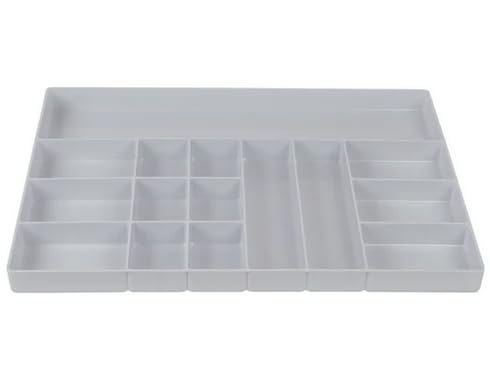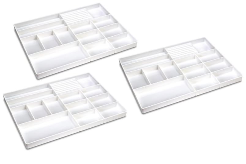 Drawer Organization Tray 3/Pieces. White. Four configurations of drawer organizers offer flexible custom solutions for various storage needs Keep all of your supplies and small components tidy, organized, and easily accessible with Drawer Organization Trays. White, high-impact polystyrene with rounded corners. Tray Size: 16"W x 12-3⁄16"D x 1"H