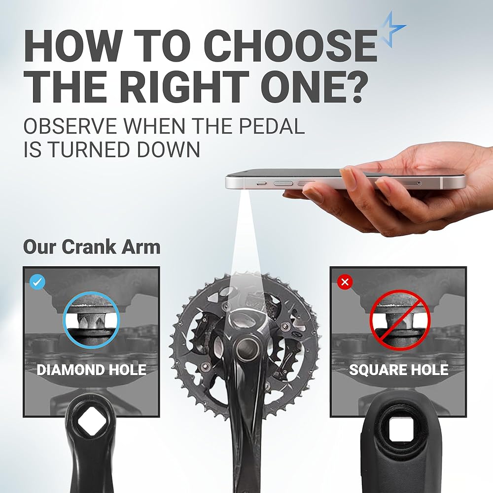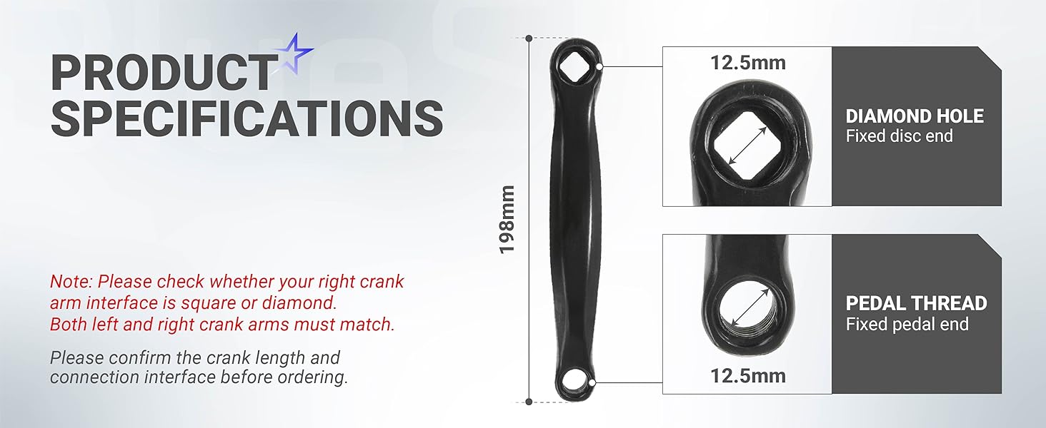 IMPORTANT NOTE: Please check whether your right crank arm interface is square or diamond. Both left and right crank arms must match. Please confirm the crank length and connection interface before ordering.