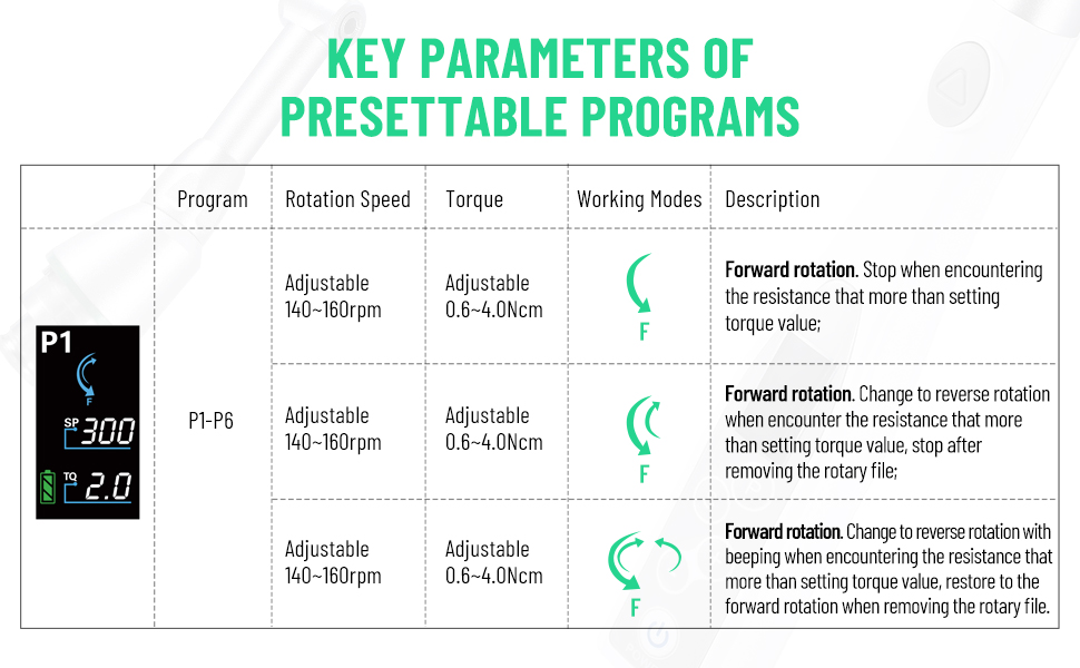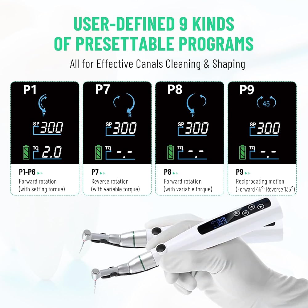 User-defined Working Modes: The endo motor allows users to define some few key parameters including rotation direction, torque (0.6~0.4Ncm) and rotation speed (140~600rpm), through 9 built-in presettable programs.