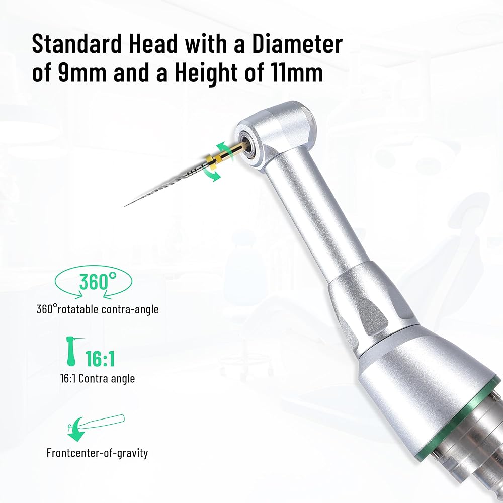 16:1 Contra Angle & Autoclavable: The handpiece comes with a standard 16:1 contra angle attachment, which is 360°rotatable, easily to be connected to the motor, and the push-button design makes it easy for rotary file replacement. The attachment is also autoclavable up to 135℃.