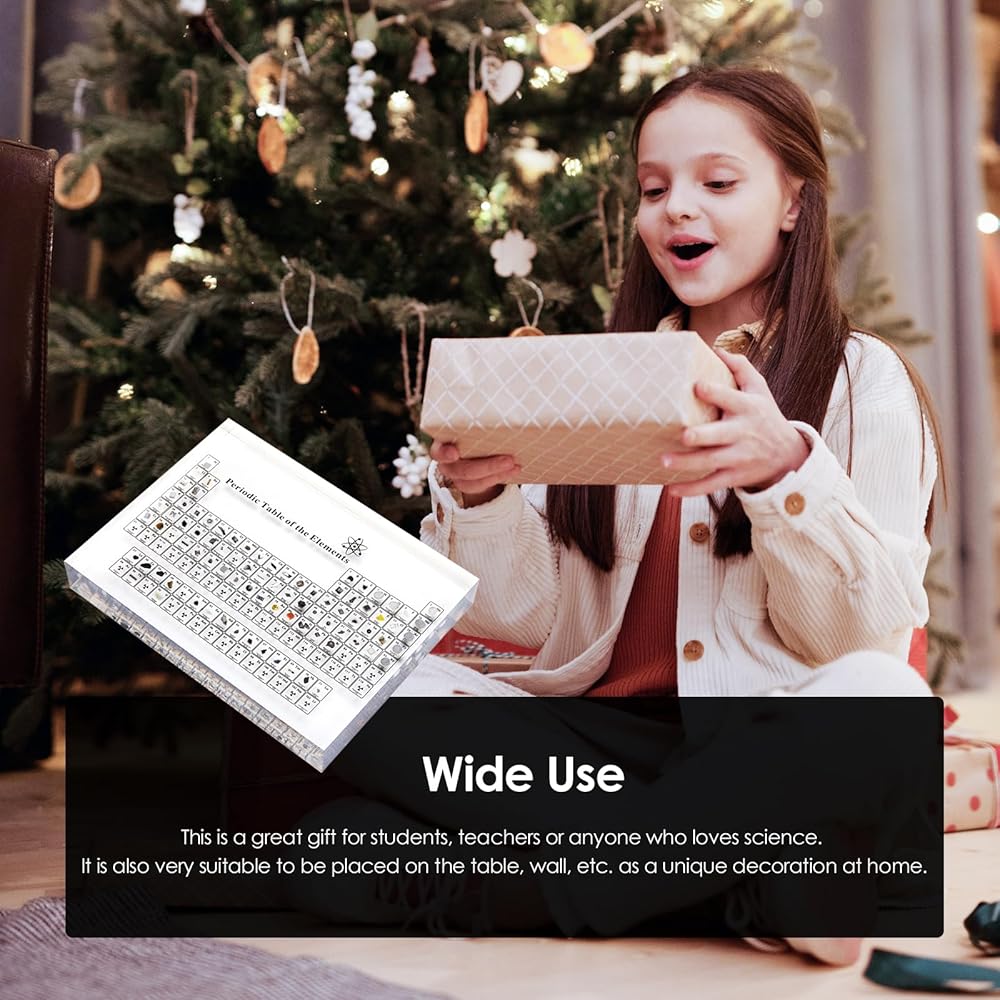 【Perfect Gift】Acrylic periodic table is a perfect gift for any scientific or chemical lovers. It is also very suitable for children and students, because the real element samples can stimulate their interest in science and chemistry. It is a perfect gift for birthday, Christmas, Thanksgiving and competition awards. It is a unique classroom or home decoration.