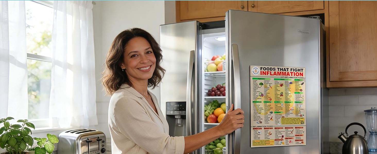 Boasts a Convenient Magnetic Design: The anti inflammatory foods chart effortlessly adheres to all fridge doors in the healthy kitchen without tools. Its flexible material securely conforms to curved and flat surfaces for constant accessibility.