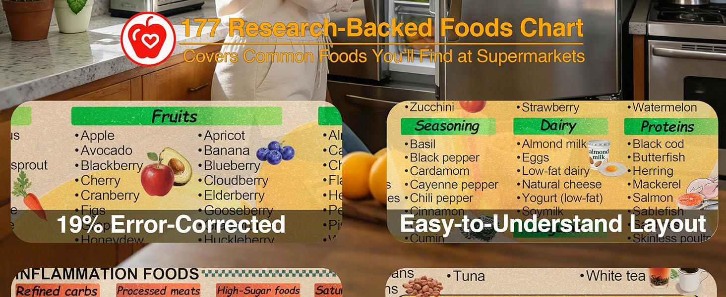 Serves as an Essential Shopping & Meal Prep Reference: With 177 researched items, this magnetic chart acts as a practical food chart fridge visual aid for an anti inflammatory diet, supporting informed food and drink choices right from the kitchen.