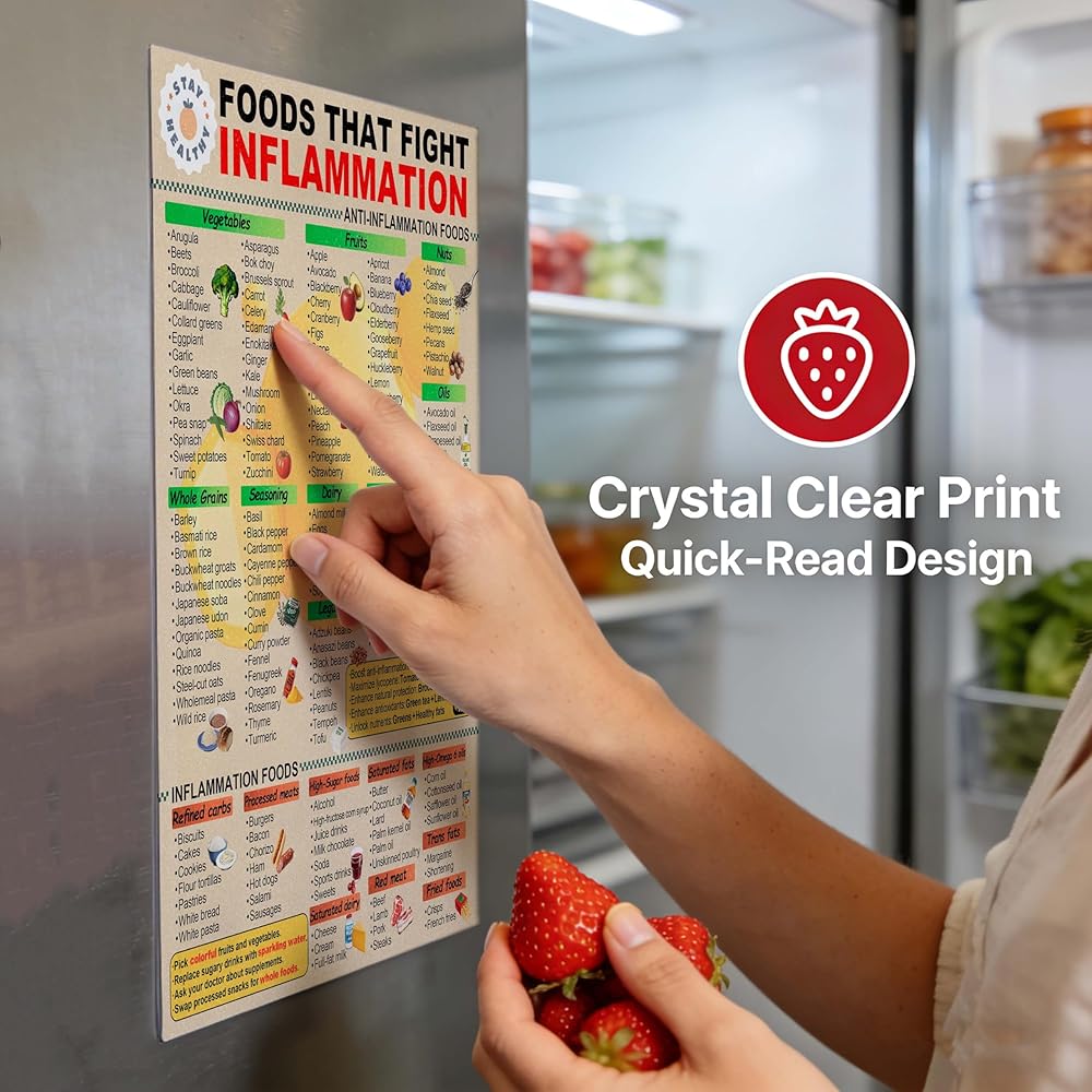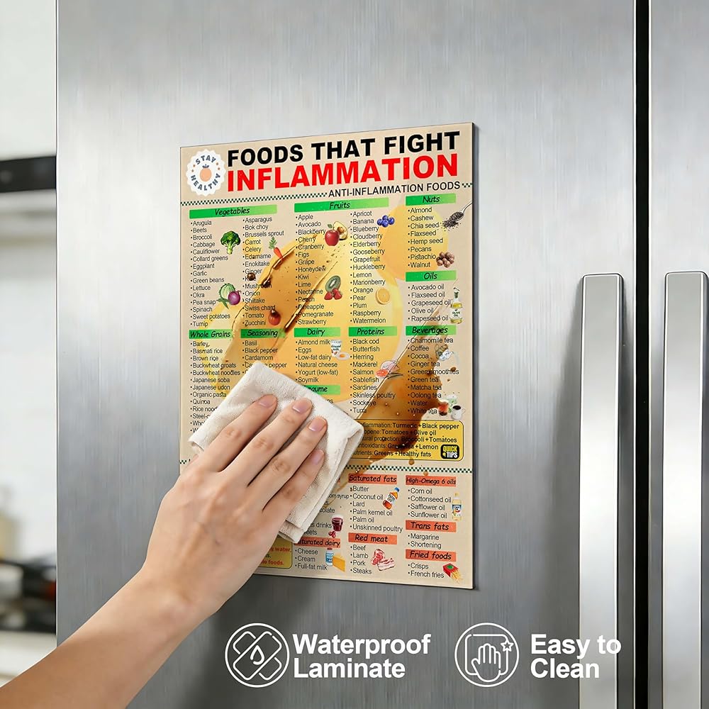 Showcases a Durable & Water-Resistant Fridge Magnet Build: A laminated surface resists stains and wipes clean easily. This sturdy anti-inflammatory diet chart is built to last, resisting curls or degradation for long-term reliable kitchen use.