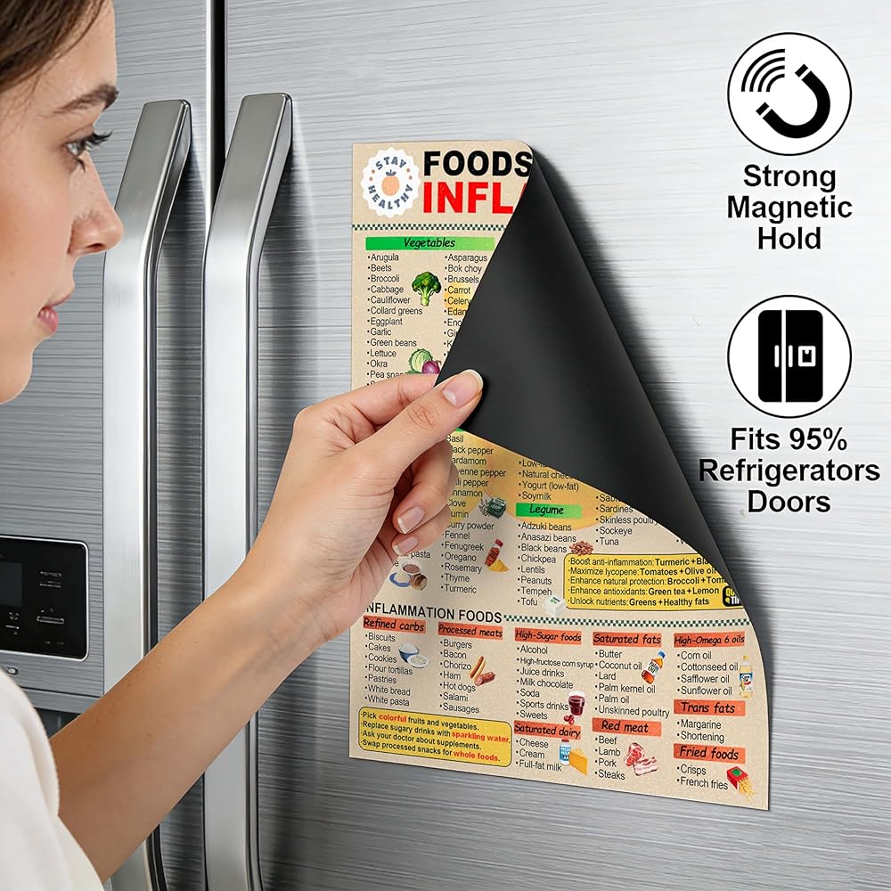 Large Size for Easy Reference: The 8.5" x 11" format frames this anti inflammatory food guide as a practical fridge chart and sleek magnetic decor, delivering ample visual space with enhanced visibility to balance the inflammatory diet better without the guesswork.