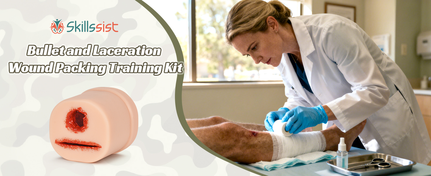 Dual-Wound Packing Trainer: This 2-in-1 wound packing trainer provides two distinct wound types — a bullet wound and a laceration wound, offering diverse wound packing training scenarios in a single wound care training simulator