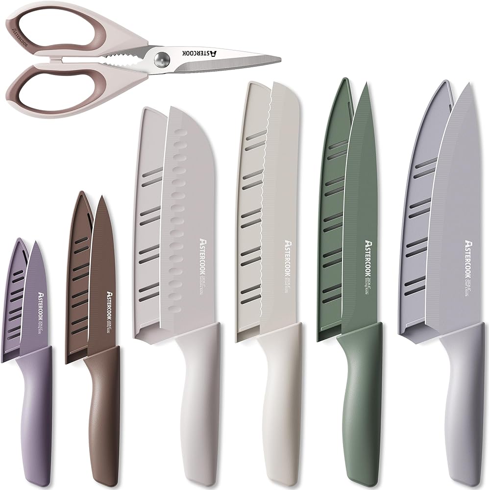 Multipurpose Knife Set: This kitchen knives set includes 8" Chef Knife, 8" Slicing Knife, 7" Santoku Knife, 8" Serrated Bread Knife, 5" Utility Knife, 3.5" Paring Knife, Kitchen Shears and 6 pcs Blade Guards