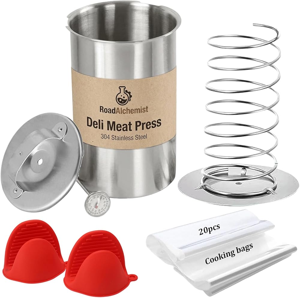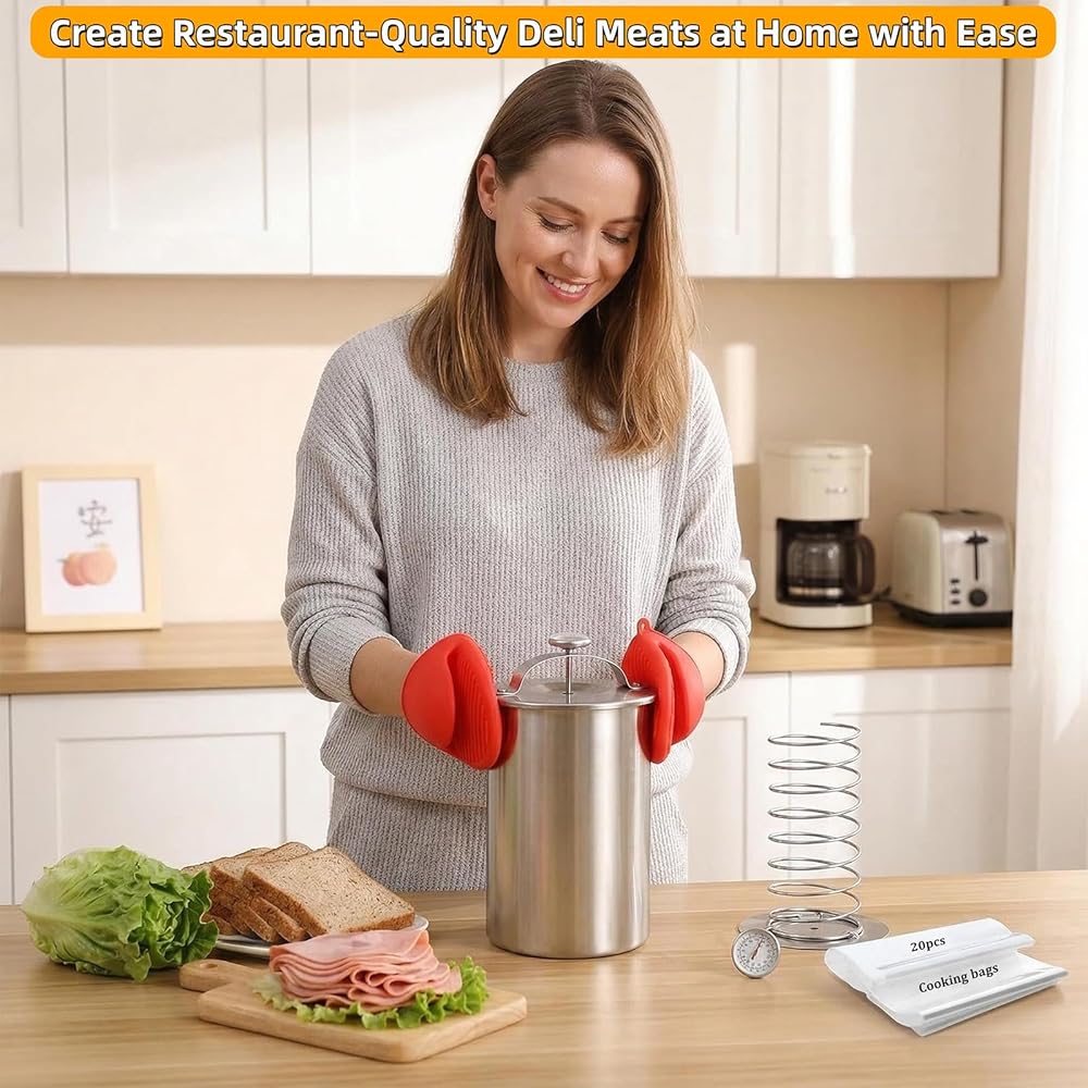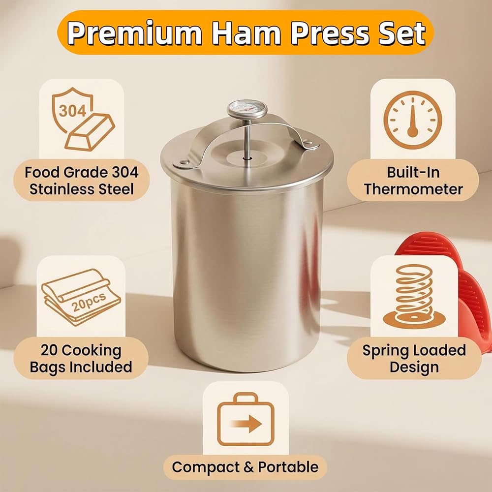 Deli Meat Press Stainless Steel with Thermometer, Lunch Meat Press Mold, Ham Maker Meat Press Tool, with 20 Cooking Bags + 2 anti-scalding clips, for Making Sandwich, Delimeat, Lunchmeat