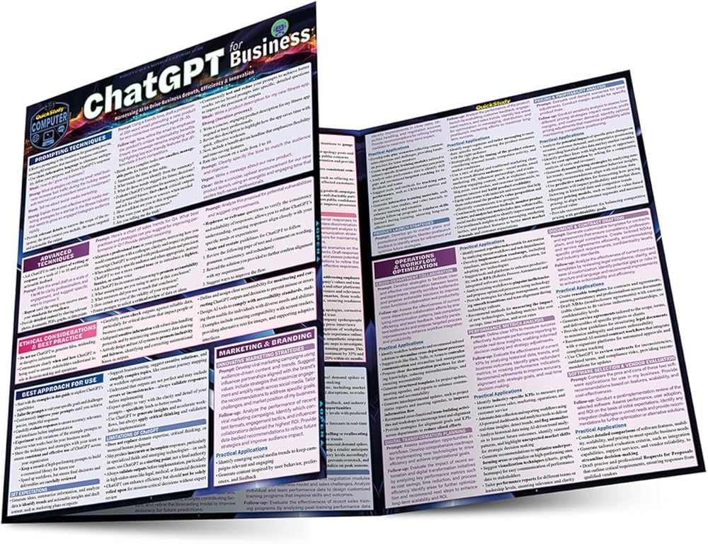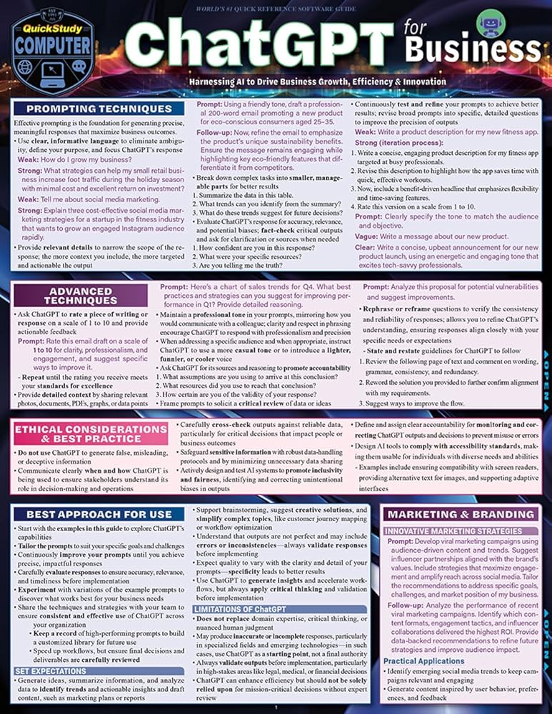 Artificial intelligence can be free or inexpensive and still is a tool that will boost productivity and creativity, help generate efficiency, and support innovation that leads to business growth. Knowing how to ask AI the right questions is called “prompt engineering”. This six-page laminated guide provides strategies, insights, and guidance for prompt engineering that can unlock the kind of support AI can offer as a resource to reach goals faster and with better results. Grow business skill sets so your resources become stronger and Individuals and teams have more time to focus on critical thinking and decision making. Technical writer and AI prompt engineer Frank Blackwell streamlined his knowledge of AI use for beginners and those already using ChatGPT for a versatile reference that will change the way you communicate, work, and produce. This handy and durable tool covers more per page than any book or website and will crack the code to unleash the value of AI for an amazingly low price.