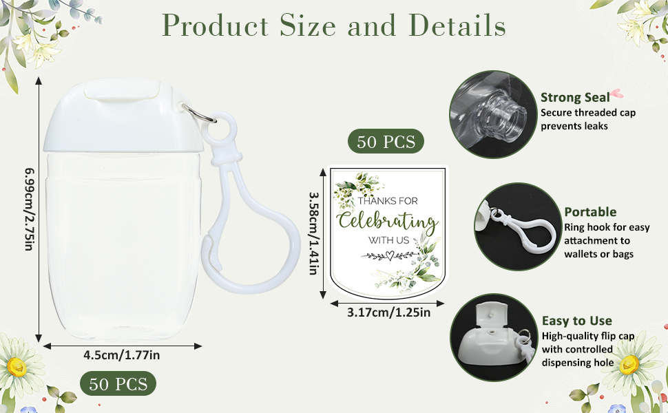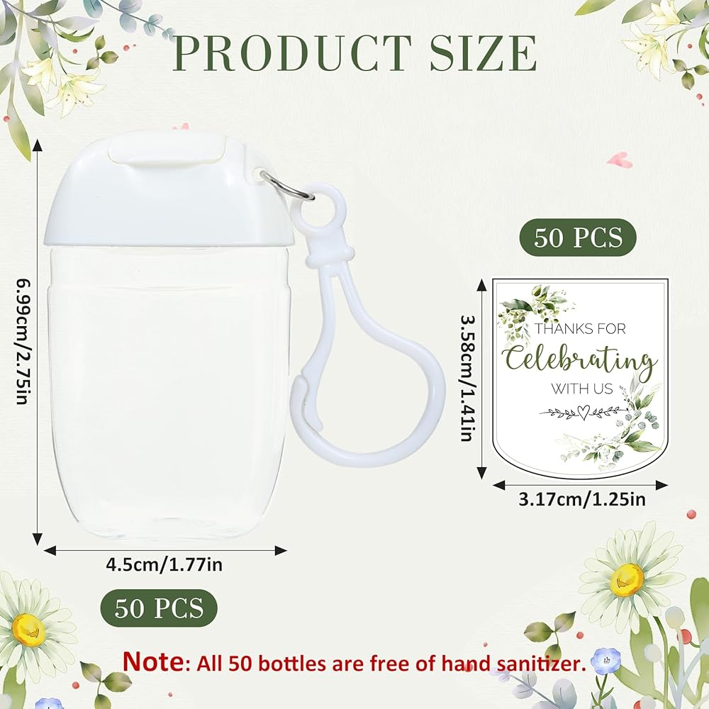 CONVENIENT AND PRACTICAL FOR ANY OCCASION - Designed with a handy hook, these hand sanitizer favors for wedding can be easily attached to a purse or bag, making them an ideal thank you gift for on-the-go use. After filling with your favorite sanitizer, your guests can clean their hands wherever they are. This convenient feature makes them perfect hand sanitizer party favors that your guests will truly appreciate. Whether it's a recordatorios para bodas or a baby shower gift for guests, these practical and thoughtful party favors offer your guests something they'll use long after your event.