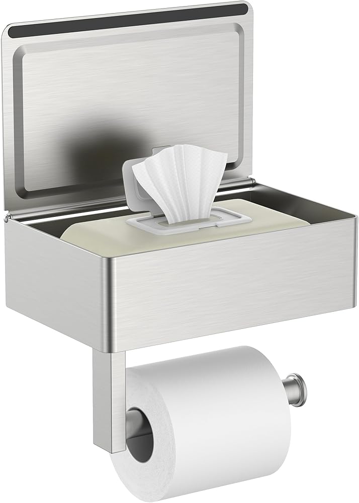 Discreet & Versatile Storage: This toilet tissue holder features a built-in, lidded storage shelf designed to discreetly hold wipes, sanitary napkins, tampons, or other personal essentials—keeping your bathroom tidy and clutter-free while also helping to prevent odors