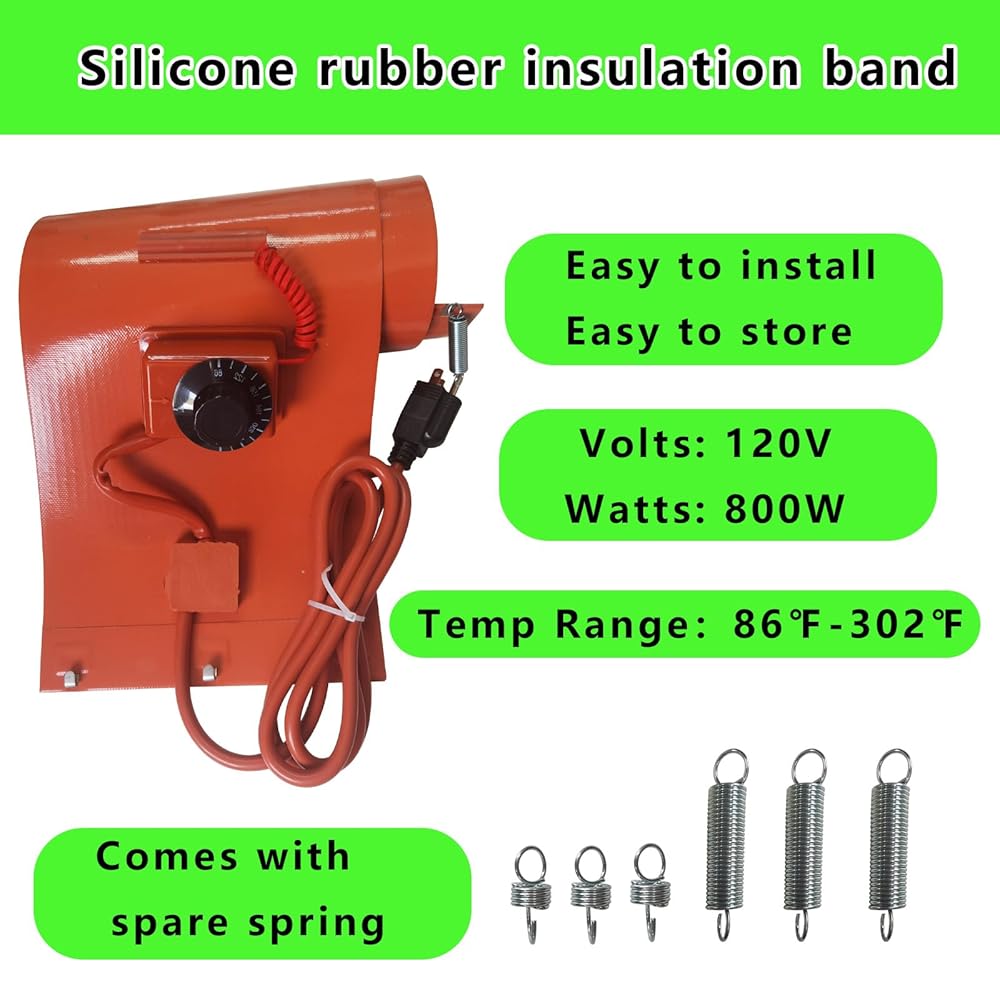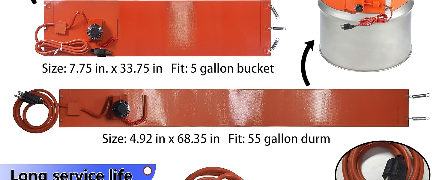 120V 800W adjustable bucket heater (80-300°F/30-150°C), 7.75" x 33.75” with spring connection a 5 gallon bucket heater.