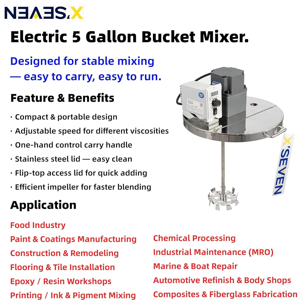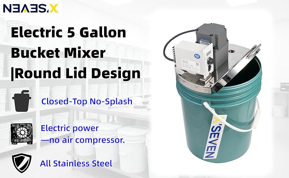 Lid-Mounted 5 Gallon Bucket Mixer—Lid-mounted electric mixer designed to fit most 5 gallon buckets; simply place the lid on the Bucket, clamp it in place and mix with less splashing in small batches.