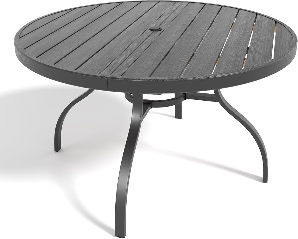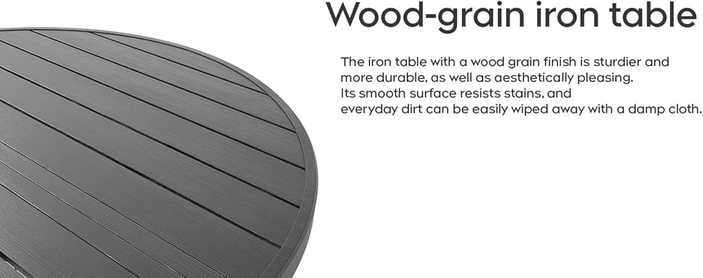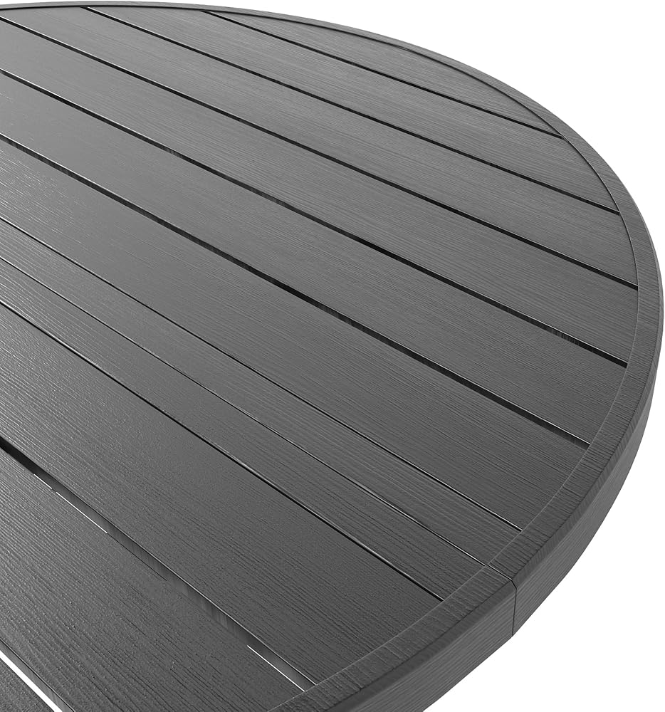 LIFELIKE FAUX WOOD SLAT TOP – Experience the timeless warmth of natural wood grain without the constant upkeep. Unlike real wood that rots, warps, or cracks over time, this round patio table features a realistic slatted texture that captures the beauty of nature. Designed for outdoor dining, it offers zero maintenance so you can enjoy that morning coffee or evening meal on your patio without worrying about weather damage.
