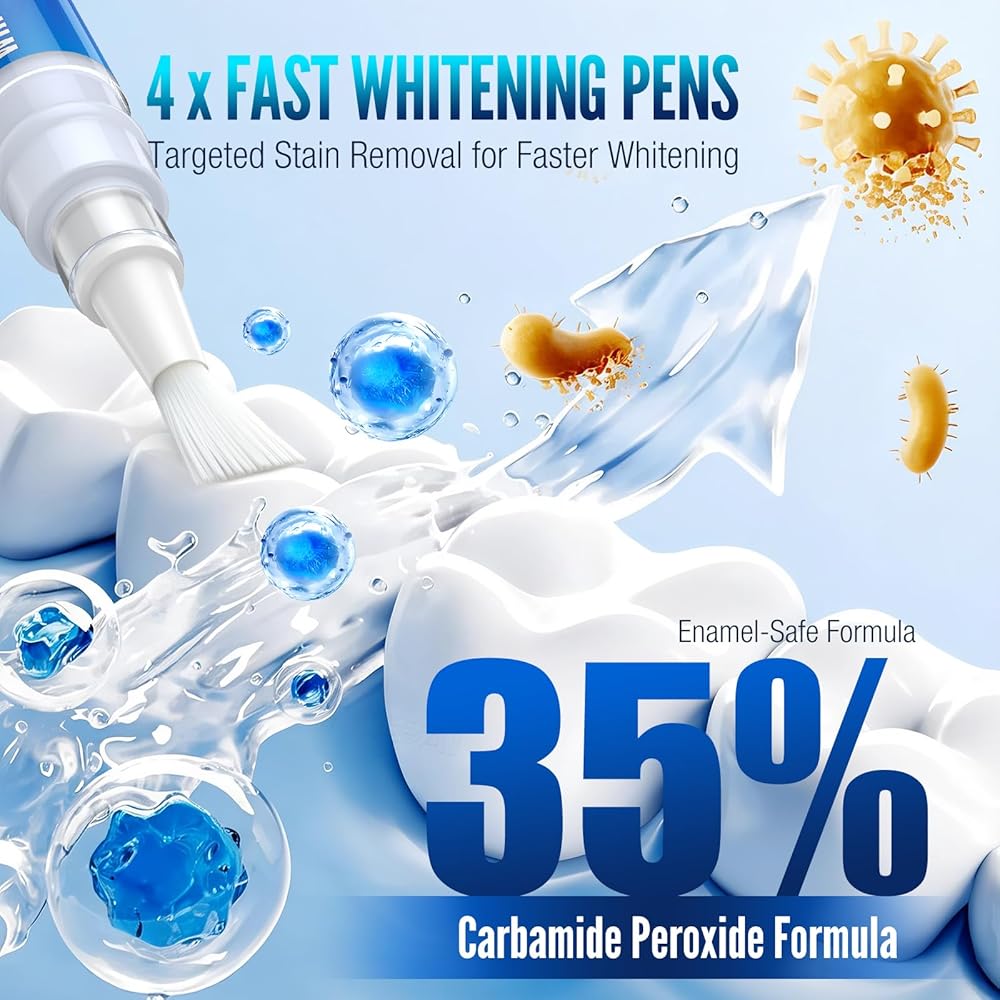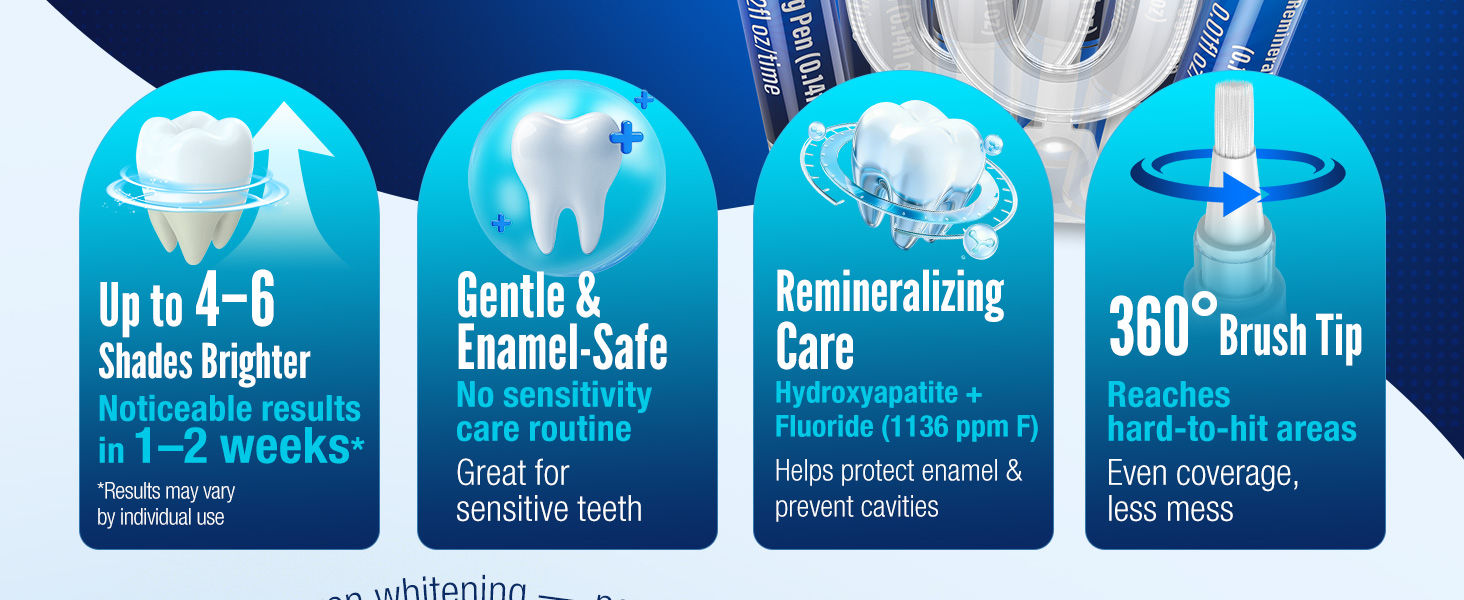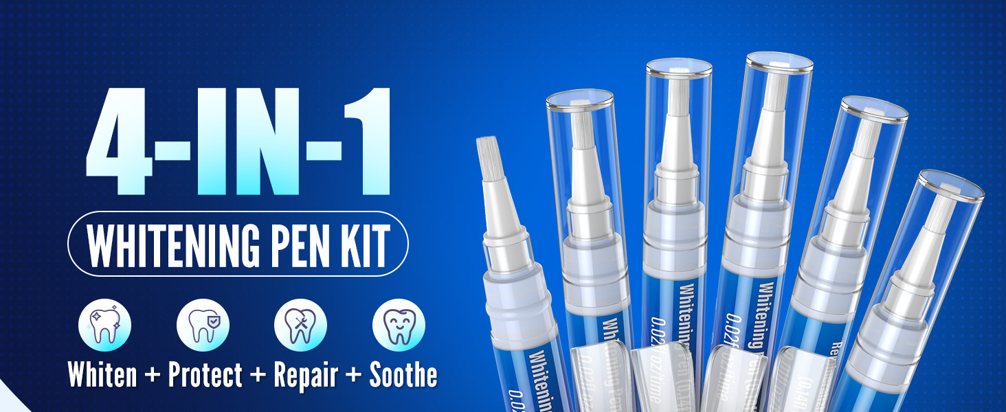 4 Whitening Pens for Targeted Stain Removal:Includes 4 fast whitening pens with precision brush applicators that allow targeted application. Unlike messy trays or strips, this whitening pen kit makes it easy to treat stains exactly where needed.