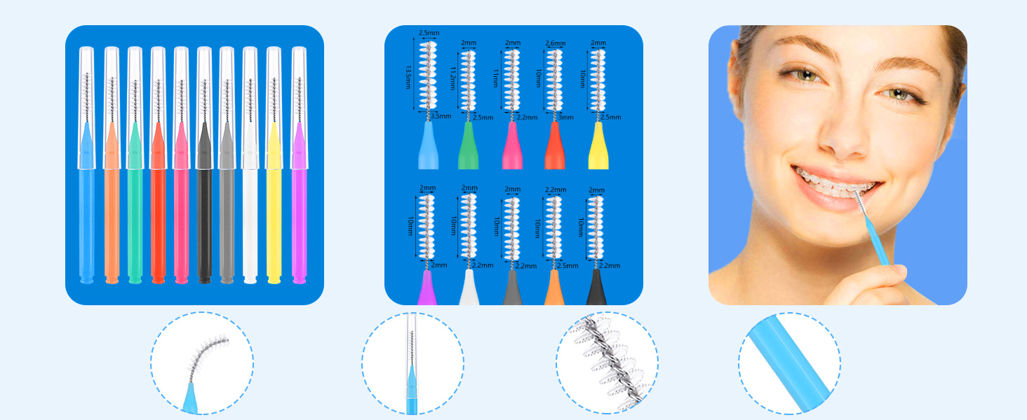 【6 Sizes Available】Toothpicks floss picks are available in 6 different sizes. The diameter of the yellow and gray powder brush head is 2mm, the black, purple and white are 2.1mm, the sky blue brush head and brush tail diameter is 2.5x3.5mm, the red is 2.5x3mcm, the orange is 2x3mm, and the green is 2x2.5mm. The 6 different sizes can cope with cleaning of different tooth spacings.