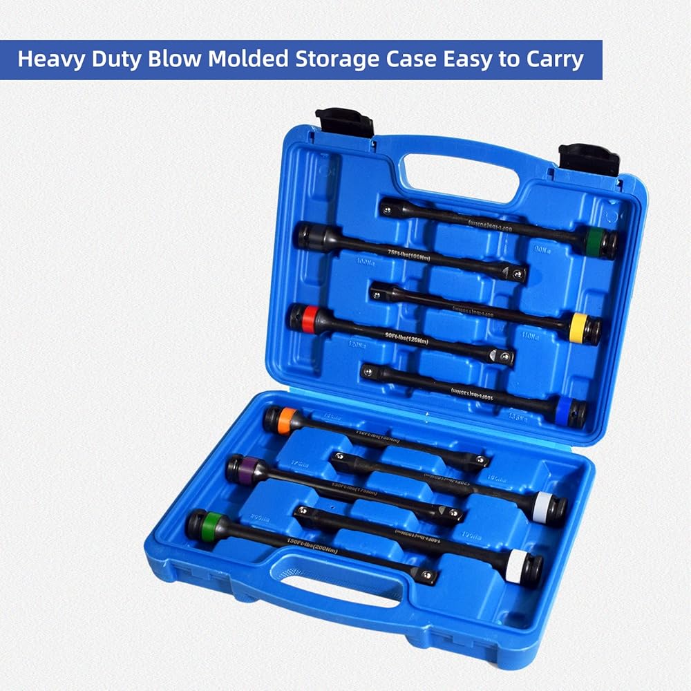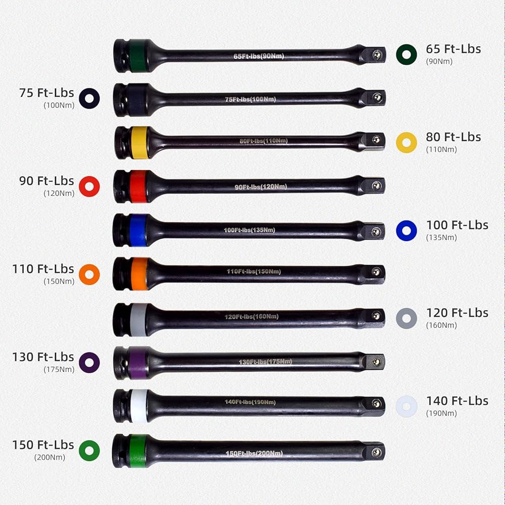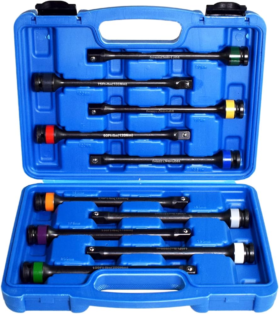 مجموعة Alltooetools المكونة من 10 قطع: تشتمل مجموعة عصا عزم الدوران سهلة الاستخدام من Alltooetools على 10 عصي عزم دوران مع الحدود الأكثر شيوعًا - 65، 75، 80، 90، 100، 110، 120، 130، 140، و 150 قدمًا - رطل - تعمل مع مفتاح ربط 1/2 بوصة لتوفير إحكام فعال وآمن لمركبتك العروة المكسرات.