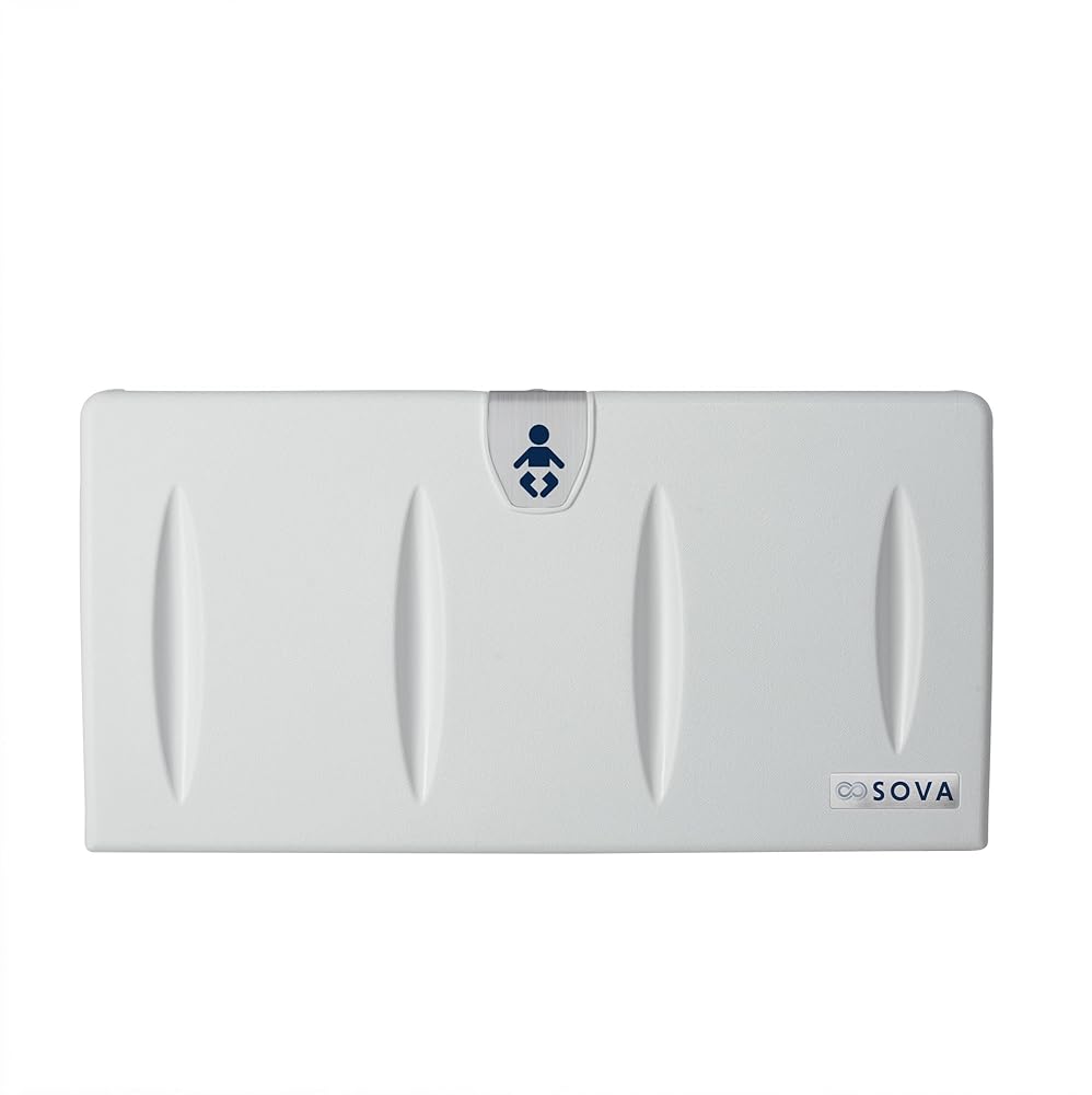 The Origin Horizontal Baby Changing Station by Sova combines sleek design with exceptional durability for commercial restroom environments. Crafted from 100% polyethylene, this surface-mount changing station is effortless to clean, making it ideal for high-traffic facilities. With a generous 250-pound weight capacity, the station features a heavy-duty steel-on-steel hinge system for superior strength and longevity. The adjustable safety strap secures infants with one-handed operation, while the built-in liner dispenser and integrated bag hook add convenience for caregivers. The innovative EZ Mount Backer Plate simplifies installation by eliminating the need for structural blocking. When closed, the unit's slim profile (34.3" L x 3.83" D x 17.5" H) maximizes available space, and when open, it provides ample room (34.3" L x 17.5" D x 15.34" H) for changing. Made in the USA with limited imported components, this ADA-compliant changing station comes with a 5-year warranty when properly installed and maintained.