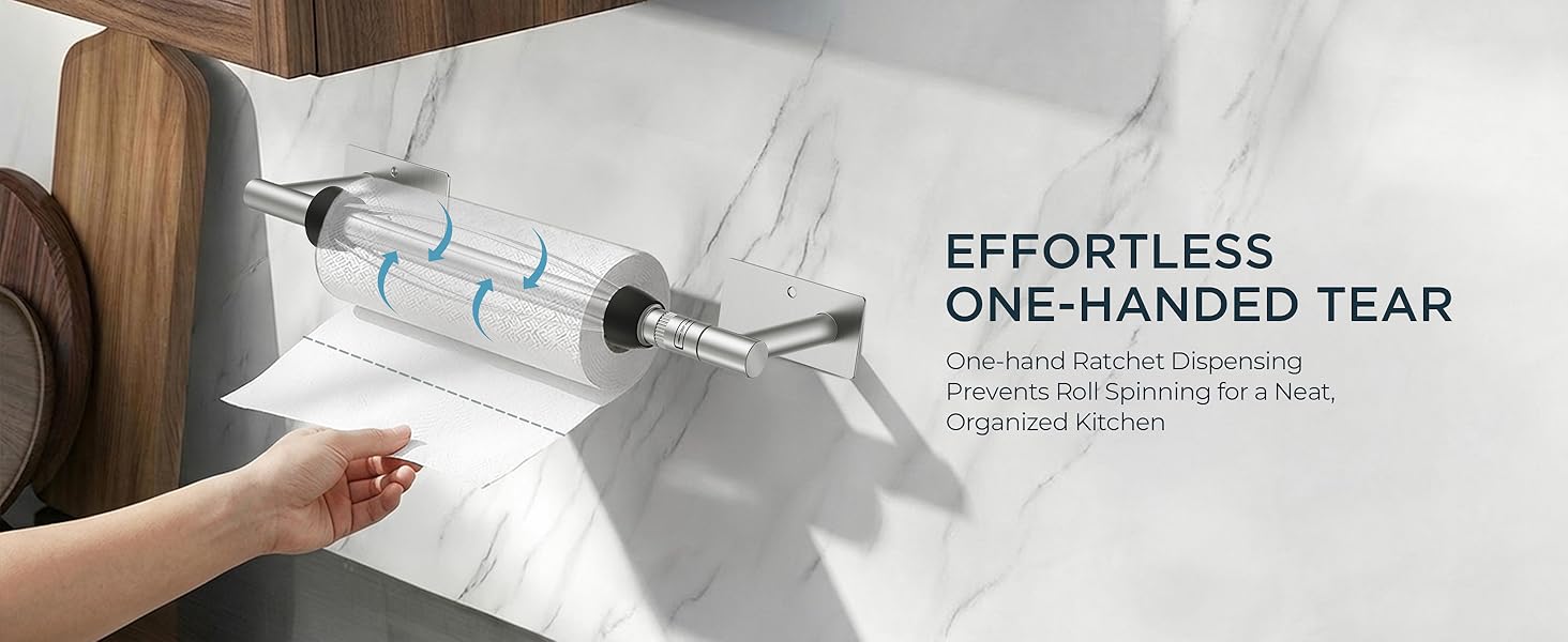 • 【Smooth One-Hand Tear】: The advanced damping system ensures controlled, even paper feed—eliminating over‑spinning or messy tears. This paper towel holder under cabinet keeps the roll tidy and ready to use every time