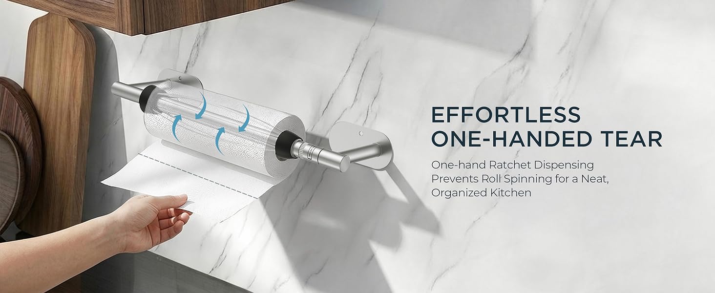 【Smooth One-Hand Tear】: The advanced damping system ensures controlled, even paper feed—eliminating over‑spinning or messy tears. This paper towel holder under cabinet keeps the roll tidy and ready to use every time