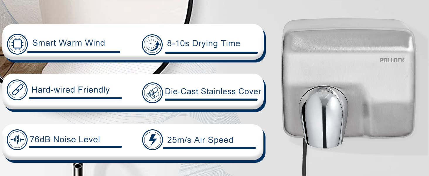 Eco-friendly & Energy-saving: Wall mounted design,the contactless hand dryer is clean and hygienic, which is eco-friendly and energy-saving, and can replace paper towels. At the same time, it reduces the hassle of buying paper towels for a long time. The safety wire is 78 cm long. If hard wiring is required, please contact a professional electrician for installation.