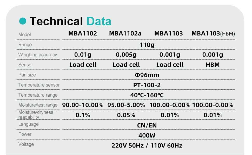 High-Performance Features: JOANLAB moisture analyzer is equipped with a highly efficient halogen heating lamp, a precision sensor, and rapid weighing capabilities. It offers a weight readability of 0.001g and a moisture readability of 0.01%. The moisture measurement range spans from 100.00% to 0.00%, with a minimum adjustable temperature of 1°C and a heating temperature range of 40°C to 160°C