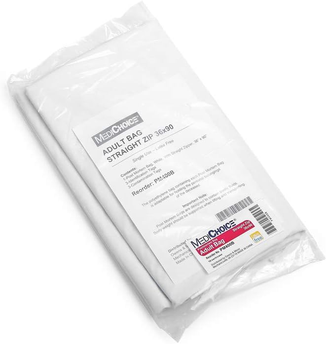 MediChoice Pediatric Postmortem Kits includes a 30 x 48 inch bag with curved zipper, 3 ID tags, 3 contamination tags. Each 7.0 mil thick bag is made of strong high grade plastic with bound edges and a