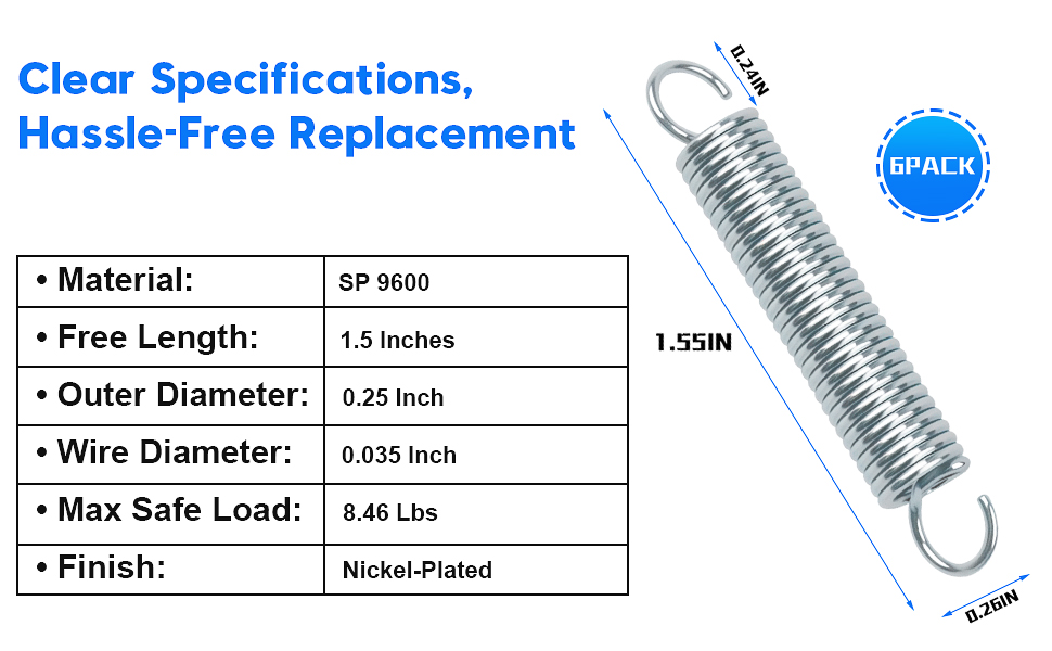 Product Information:Spring part number 9600, dimensions 1/4 in. outside diameter, 1-1/2 in. length, 0.035 in. wire diameter, 8.46 lbs. maximum safe load, 1.11 in. maximum deflection. Featuring an open-ended design, with your purchase you will receive 6 pieces of 9600 extension springs for your use and spare needs