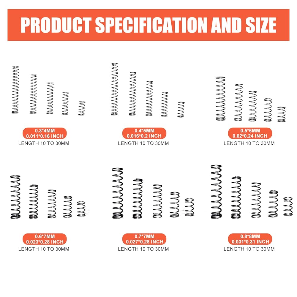 Find the right spring in seconds. The assorted springs kit includes 470 pieces across 30 logical sizes (4-8mm diameter, lengths: 10,15,20,30,35mm), all neatly stored in a sturdy compartment box.