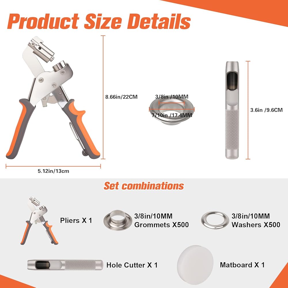 GROMMET TOOL KIT DETAILS: Leather grommet kit with 500 eyelets and grommets with 3/8inch (10 mm) inside diameter, 250 silver and 250 gold grommets, and an grommet hole punch, which makes it convenient to carry and use