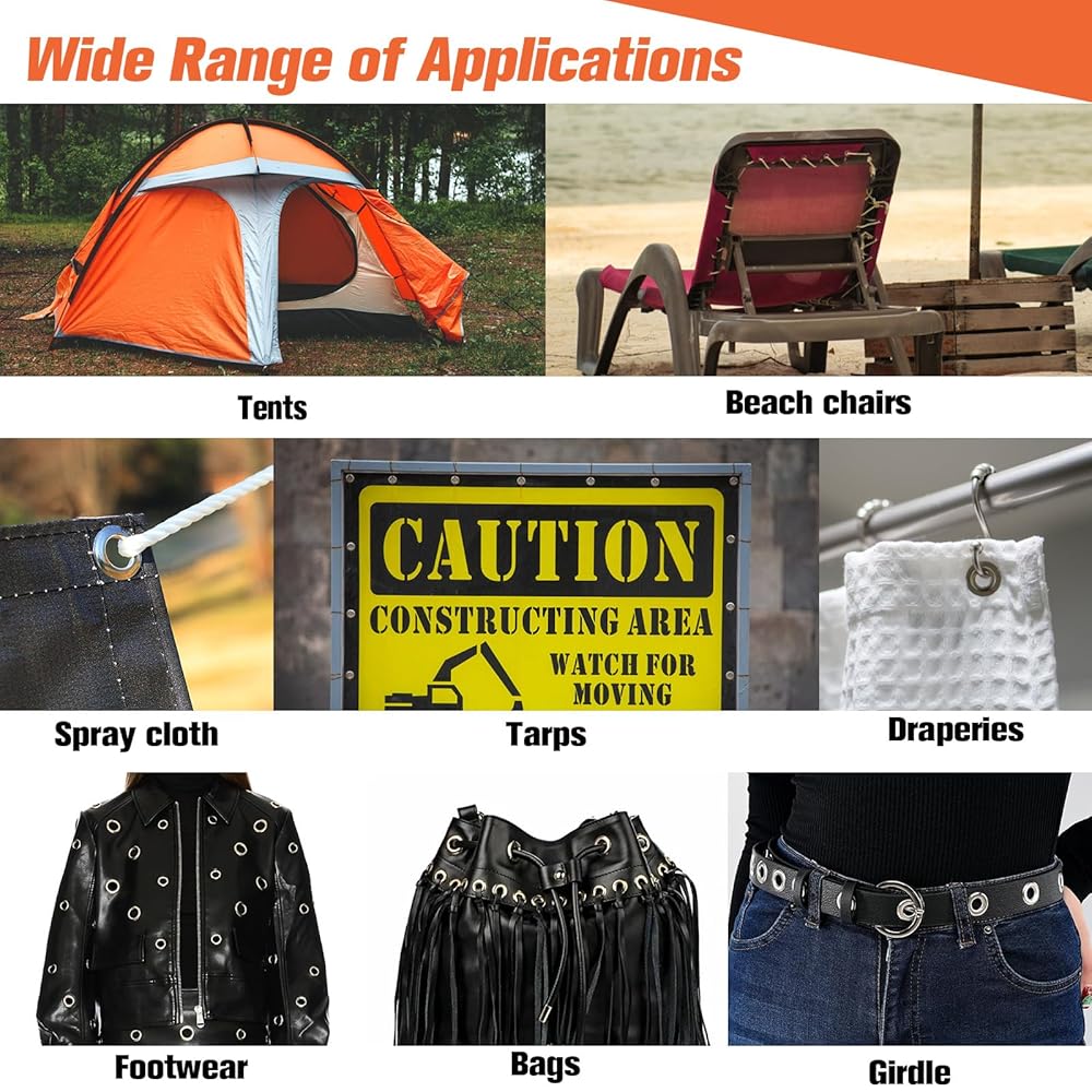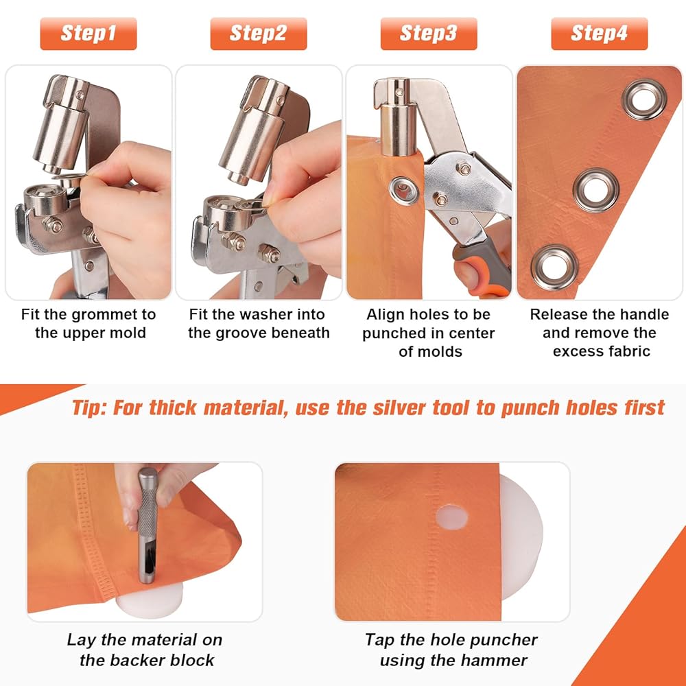 VERSATILE AND ENDURING: The professional grommets kit is suitable for use with a wide range of materials, including tarpaulins, canvas, PVC banners, and other fabrics. The grommet punch is made of steel, which resists damage and prolongs the life of the tool