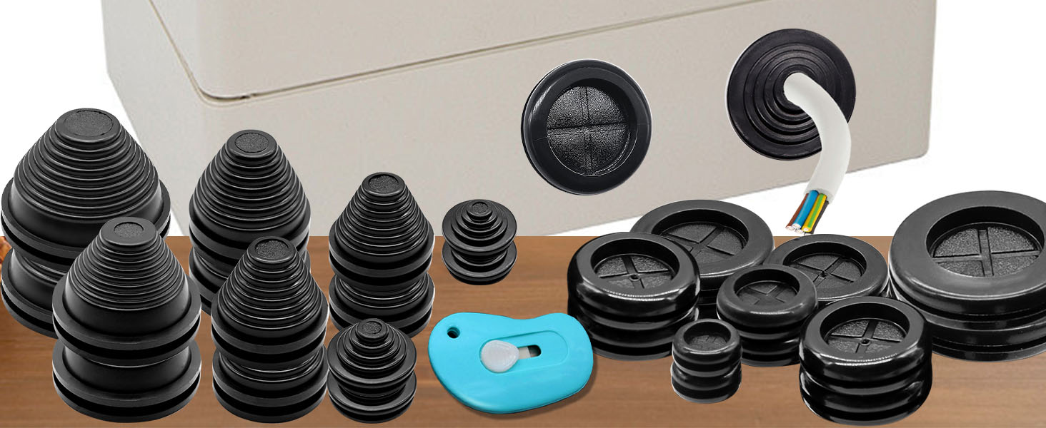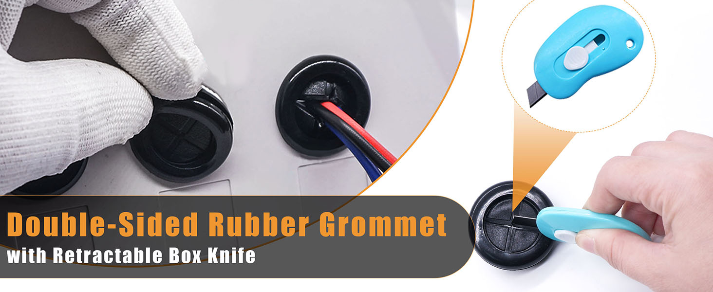 【Easy To Use】:Rubber grommet have two shapes: round and tower-shaped, which can be selected and used as needed.We equip the product with a retractable utility knife,when in use, you can adjust the diameter of the rubber gasket according to the thickness of your own cable,and cut freely.