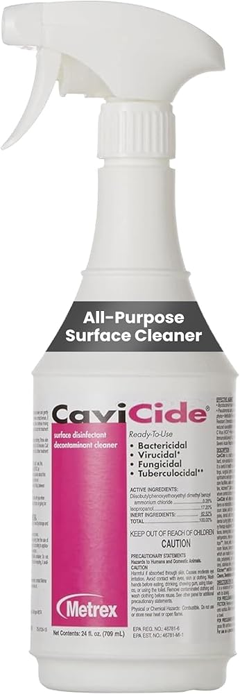 Metrex CaviCide Spray is a ready-to-use surface disinfectant and multi purpose cleaner trusted by healthcare facilities worldwide. Each 24 oz spray disinfectant is formulated to clean and disinfect hard, non-porous surfaces, including medical equipment, patient care areas, and common facility surfaces, without the need for dilution or complex preparation. Its broad-spectrum efficacy makes it effective against many organisms. CaviCide is an all purpose cleaning spray designed for convenience and efficiency, combining cleaning and disinfection in a single step. The lightweight spray bottle allows for easy application across surfaces. The formula of this disinfecting cleaner is compatible with most medical device materials and common clinical surfaces, ensuring equipment safety while maintaining hygienic conditions. This disinfectant all purpose spray cleaner is ideal for use in hospitals, outpatient surgical centers, laboratories, neonatal units, nursing homes, dental and ophthalmic offices, daycare centers, schools, emergency medical settings, correctional facilities, and health clubs. Packaged in a convenient set of 12 bottles, CaviCide ensures that critical areas remain stocked with a reliable, ready-to-use disinfectant cleaning spray. Whether used in emergency vehicles, operating rooms, isolation areas, or everyday cleaning tasks, this all purpose cleaner spray supports a safe, hygienic, and compliant environment for patients, staff, and visitors alike. Metrex CaviCide Spray is a versatile, professional solution for effective surface disinfection across multiple healthcare and institutional environments.