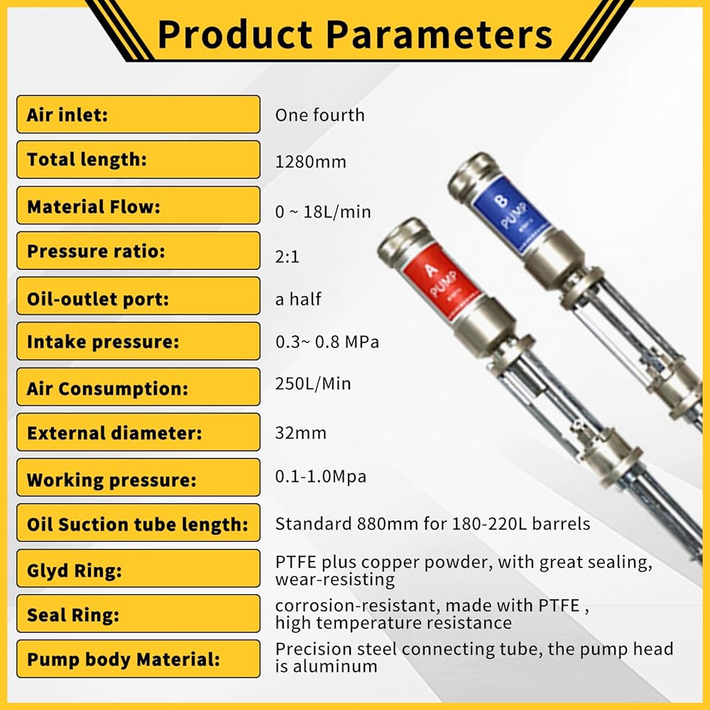Pressure ratio: 2:1 External diameter: 32mm Material Flow: 0 ~ 18L/min Working pressure:0.1-1.0Mpa Air Consumption: 250L/Min Air inlet: One fourth Oil-outlet port: a half Pump body Material: Precision steel connecting tube, the pump head is aluminum Intake pressure: 0.3~ 0.8 MPa Seal Ring: corrosion-resistant, made with PTFE , high temperature resistance Glyd Ring: PTFE plus copper powder, with great sealing, wear-resisting Oil Suction tube length: Standard 880mm for 180-220L barrels Total length:1280mm
