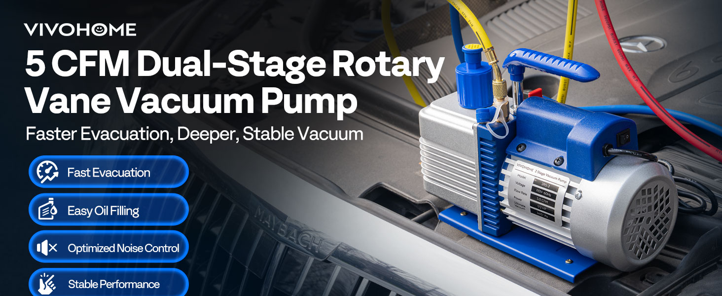 DUAL-STAGE VACUUM PERFORMANCE: Powered by a 1/2 HP 4-pole high-torque motor, this 5 CFM dual-stage rotary vane vacuum pump reaches down to 0.3 Pa, helping achieve proper evacuation before refrigerant charging for DIY HVAC, mini split, and automotive A/C servicing