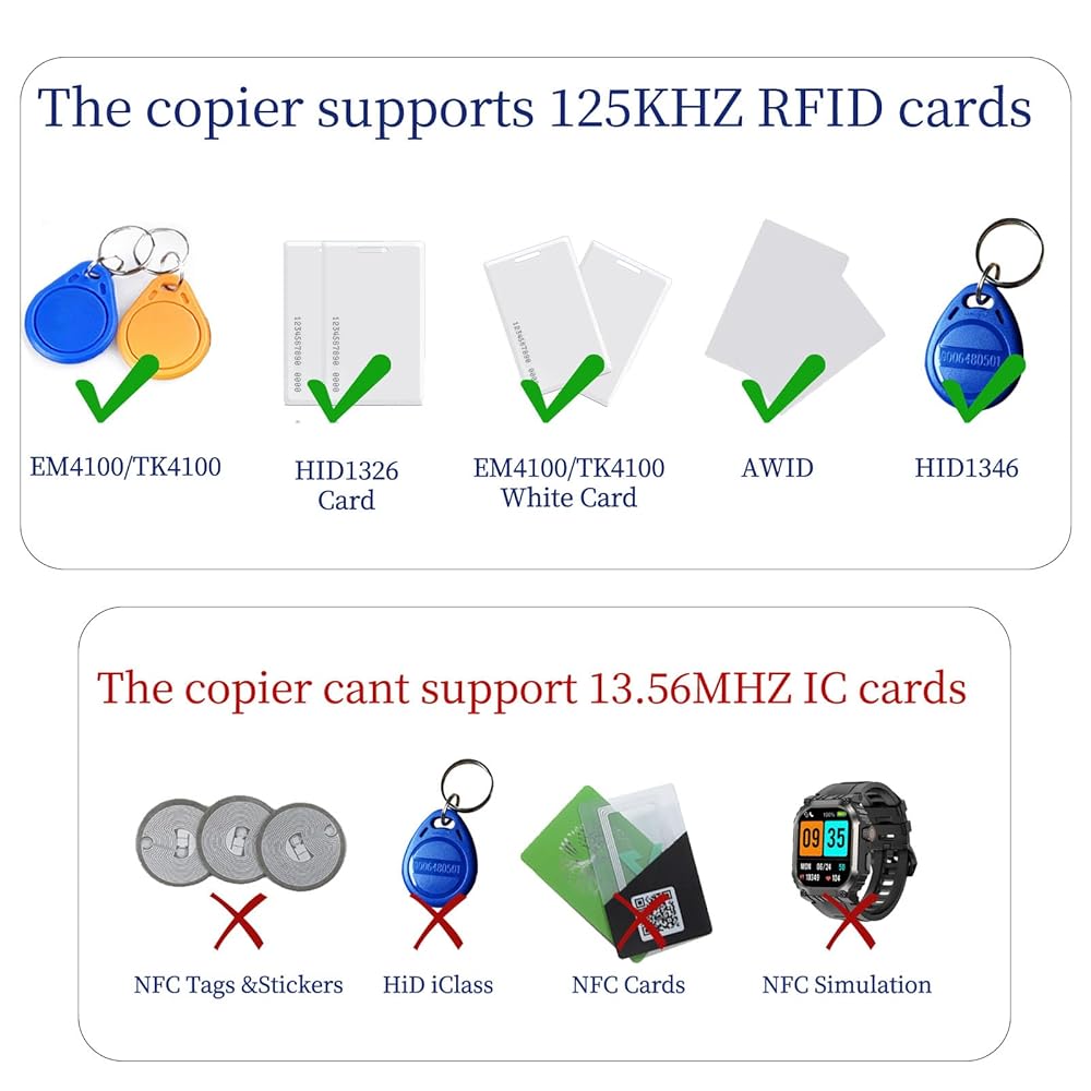Purchase Notice: If your product is EM4100, EM4305, or TK4100 with the same frequency but different cards, please confirm the card before buying. The machine can copy parking cards, access cards, switches cards, including small button-type, shaped cards